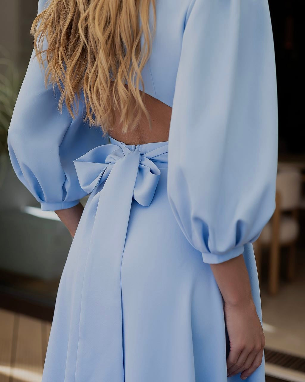 Lengvumu ir moteriškumu alsuojanti suknelė, kuri sukuria subtilų, bet įsimintiną įvaizdį. Švelniai krentantis siluetas gražiai pabrėžia liemenį, o midi ilgis suteikia elegancijos ir universalumo.Ilgos, pūstos rankovės suteikia romantikos pojūtį, o atvira nugara su kaspinu tampa išskirtiniu akcentu, kuris traukia žvilgsnius. Tai suknelė, kuri atrodo įspūdingai tiek judant, tiek stovint.Puikiai tinka šventėms, krikštynoms, vasaros vakarams ar ypatingoms progoms. Sudėtis : 65% medvilnė, 35% poliesteris