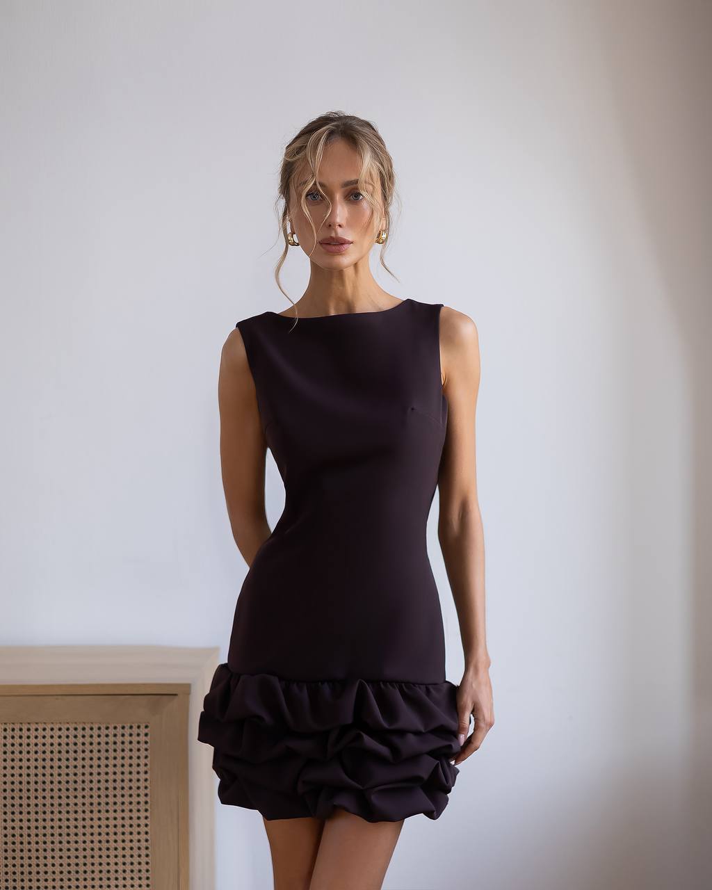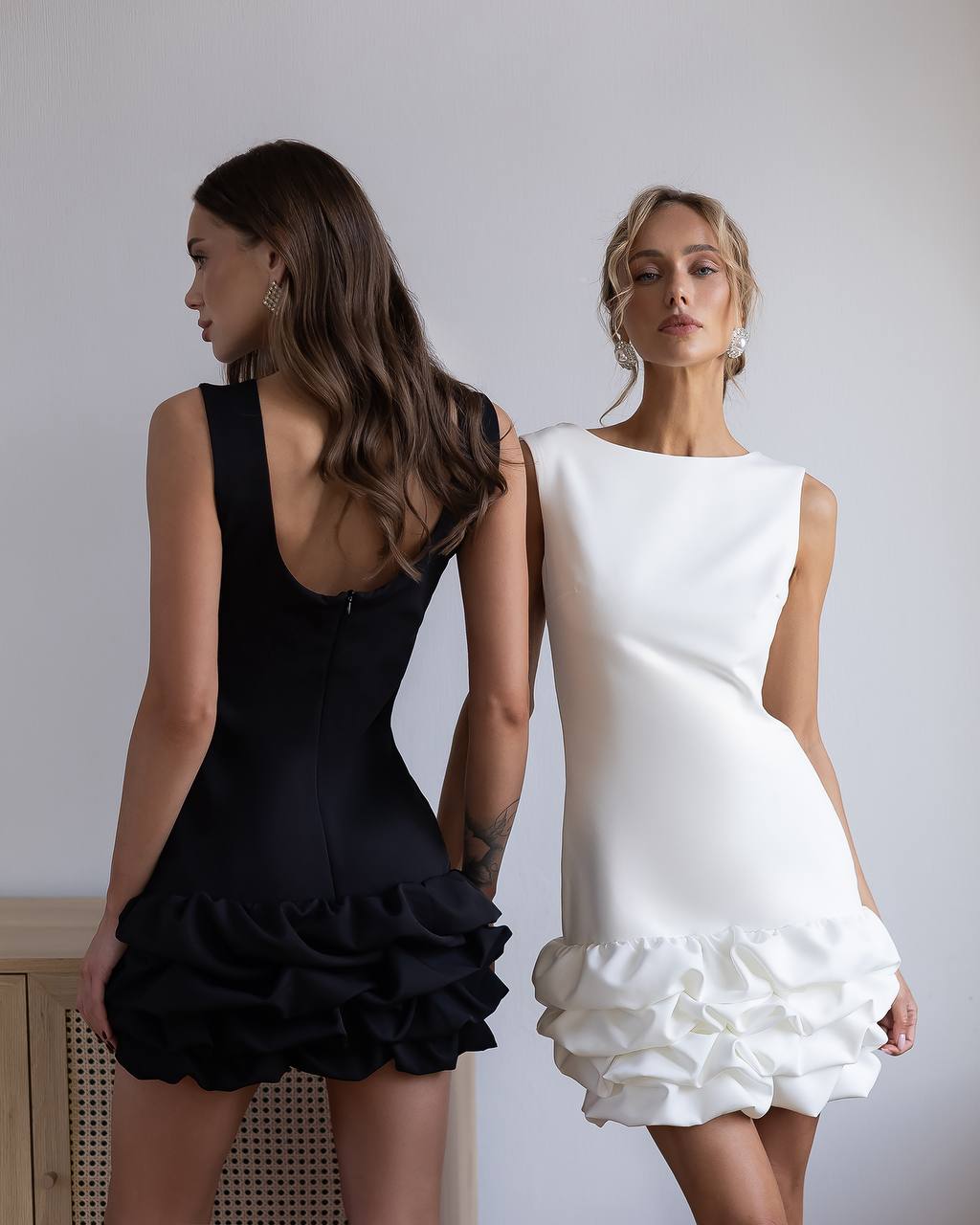Išskirtinė, figūrą pabrėžianti suknelė, sukurta moteriai, kuri nori subtiliai išsiskirti. Minimalistinis viršus dera su žaismingu, banguotu apačios siluetu, kuris suteikia įvaizdžiui lengvumo ir išraiškingumo.Suknelė gražiai priglunda prie kūno, išryškina liemenį, o atvira nugara suteikia elegantiško seksualumo. Apačioje esantys dekoratyvūs raukiniai kuria judesio efektą ir prideda prabangos pojūtį.Puikus pasirinkimas vakarėliams, šventėms ar ypatingoms progoms.