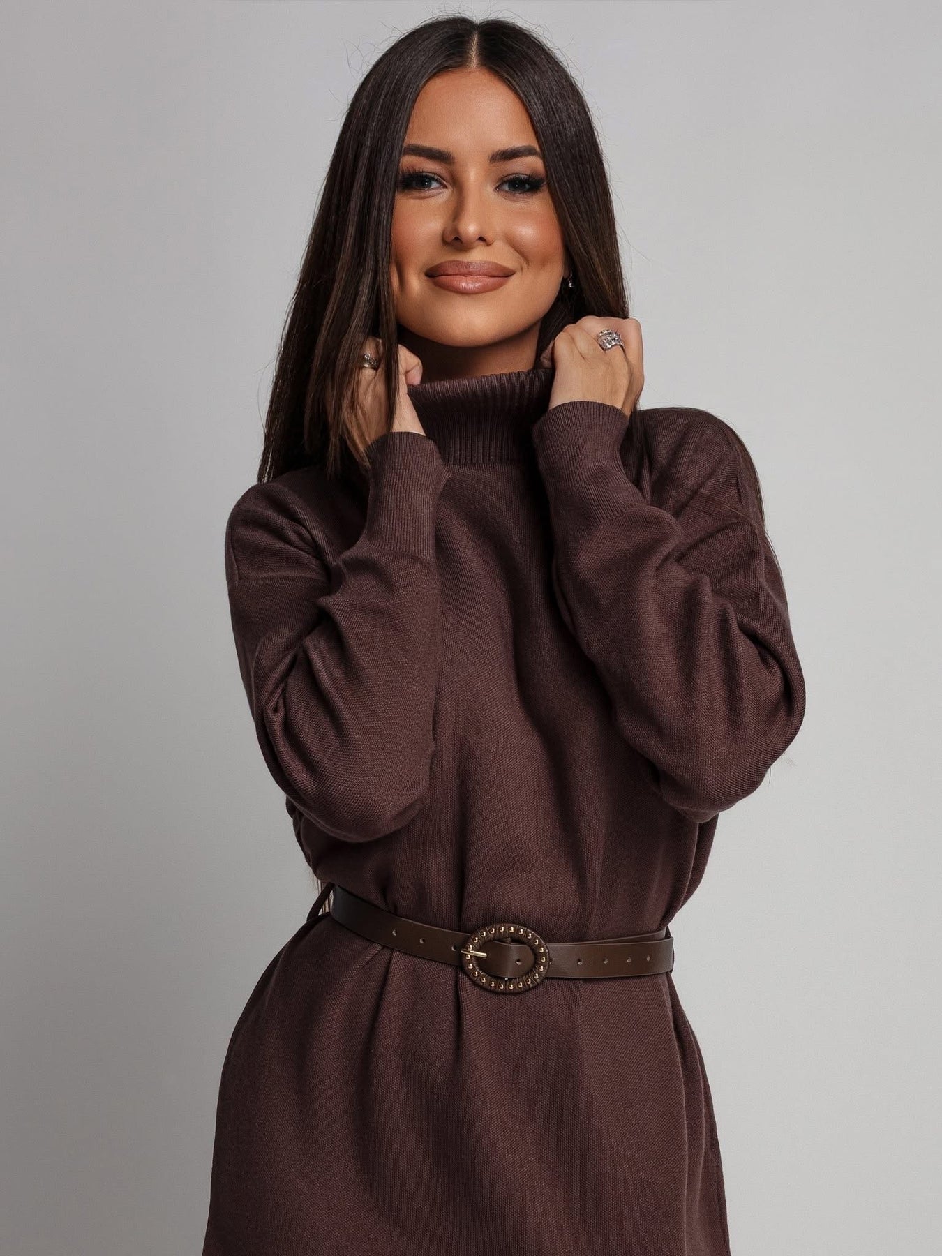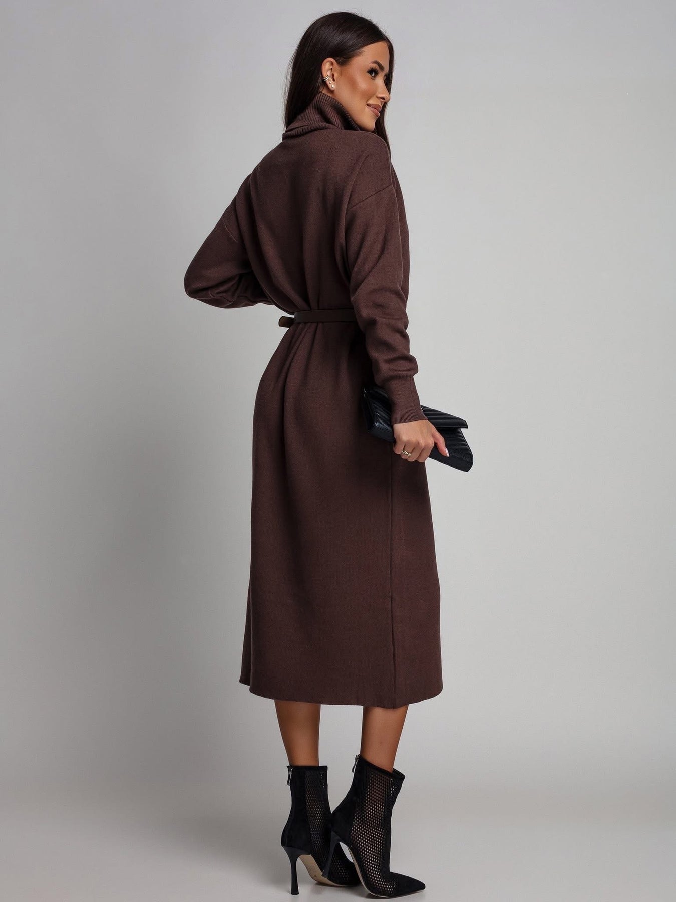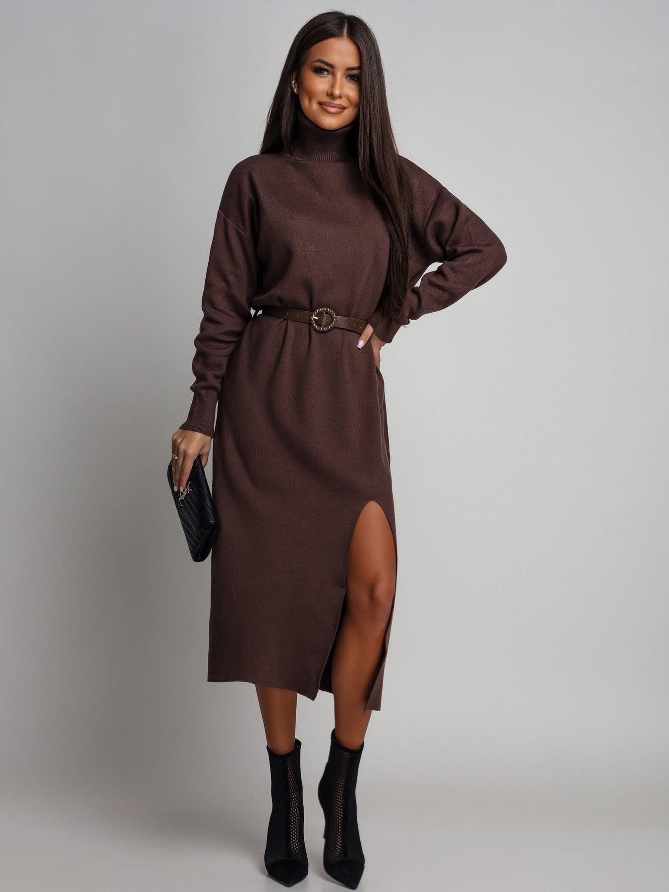 Klasikinė juoda – visada gera idėja. Ši megztinio tipo suknelė su aukšta apykakle ir elegantišku skeltuku – nepriekaištingas pasirinkimas tiek kasdienai, tiek išskirtinėms progoms. Minkštas megztas audinys švelniai apgaubia kūną, suteikia jaukumo ir šilumos pojūtį, o subtilus skeltukas suteikia įvaizdžiui moteriškumo ir lengvumo.