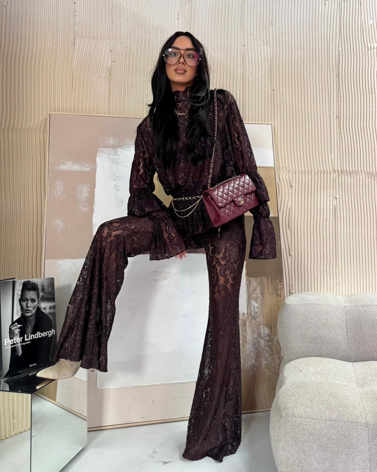Tai itin išskirtinio dizaino kelnės, kurios traukia akį savo elegantiška prabanga ir drąsiu stiliumi. Pagamintos iš ruod nėriniuoto audinio, jos subtiliai permatomos, todėl kuria moterišką ir viliojantį įvaizdį.Modelis platėja į apačią, primindamas klasikinį siluetą, kuris vizualiai pailgina kojas ir suteikia elegancijos. Nėrinių raštai suteikia rafinuotumo bei šventiško žavesio – tokios kelnės puikiai tiks vakariniams deriniams, kai norisi išsiskirti, bet kartu išlaikyti subtilų moteriškumą.Sudėtis : 95% poliesteris, 5% elastanas.