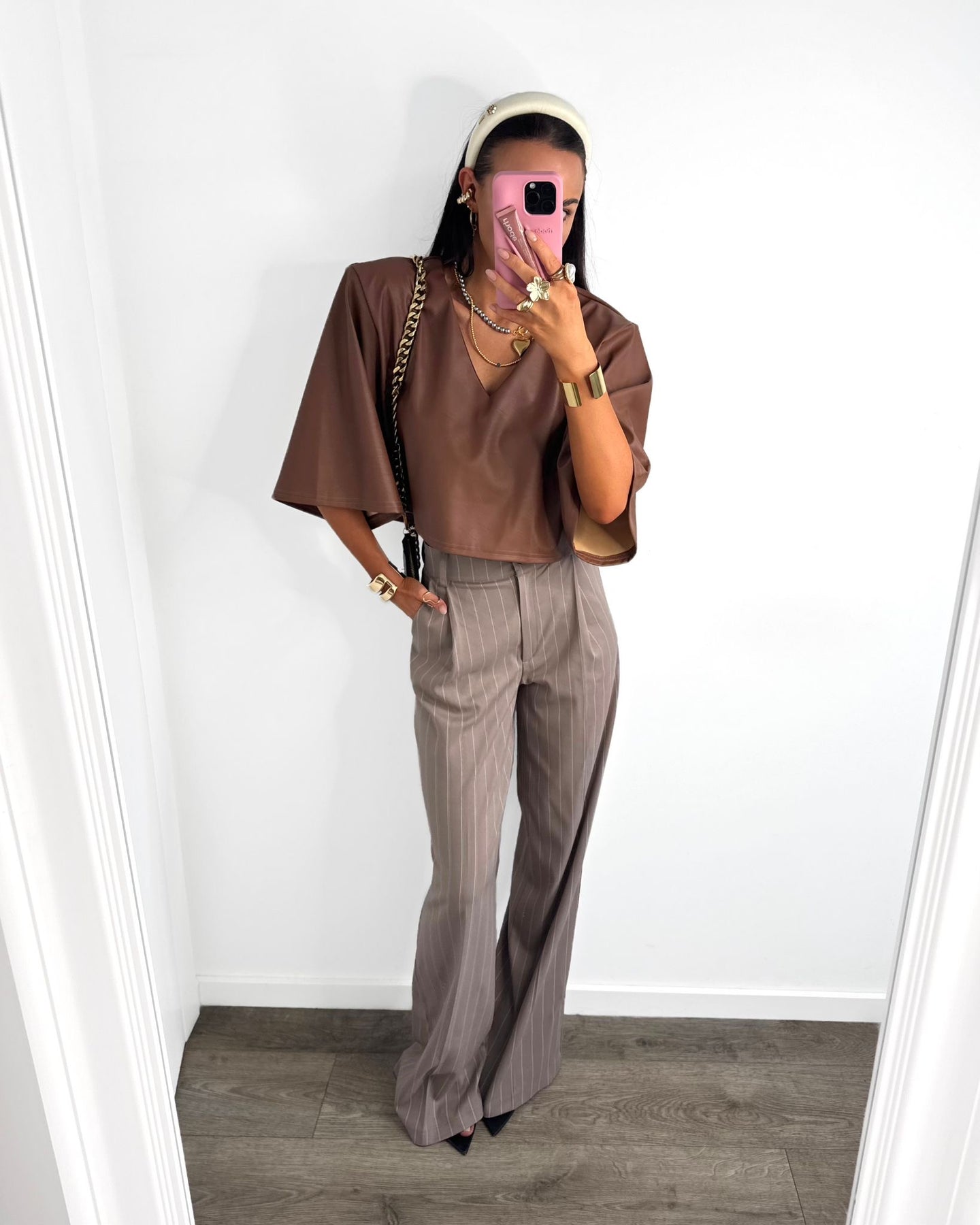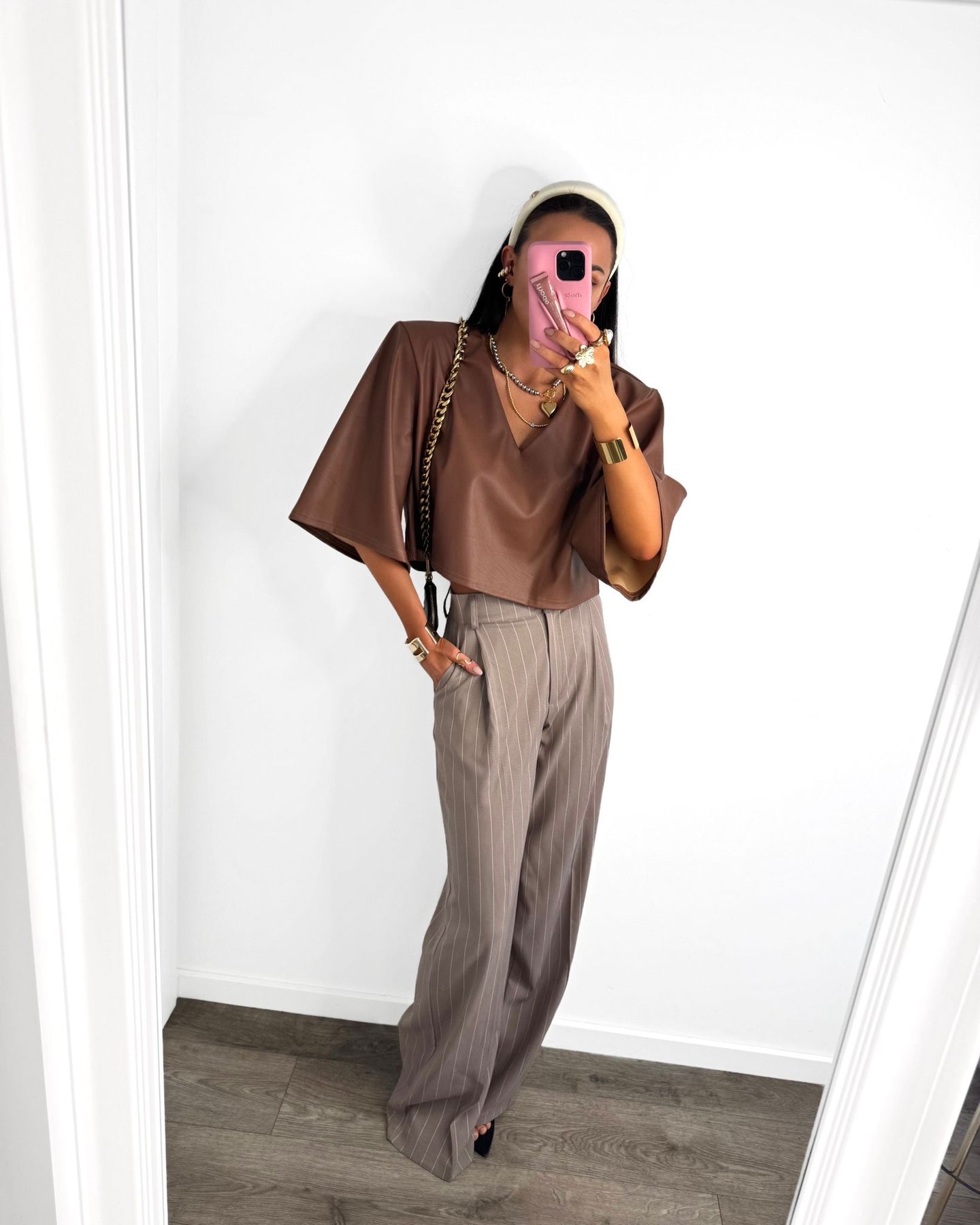 Elegantiškos plačios kelnės aukštu liemeniu – puikus pasirinkimas tiek darbui, tiek vakariniams deriniams. Klasikinis raštas suteikia subtilios prabangos, o laisvas siluetas garantuoja patogumą ir stilingą išvaizdą. Puikiai dera tiek su marškinėliais, tiek su elegantiškais švarkeliais ar palaidinėmis. Taip pat šios kelnės puikiai derinamos su mūsų eko odos palaidine Mia. Sudėtis : 95% viskozė , 5% elastanas.