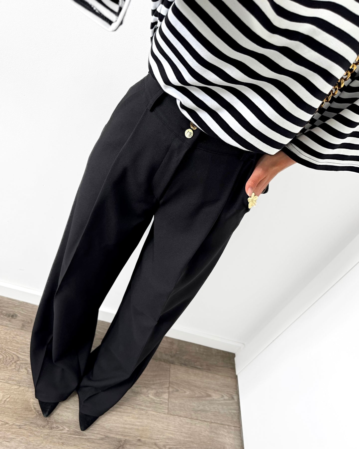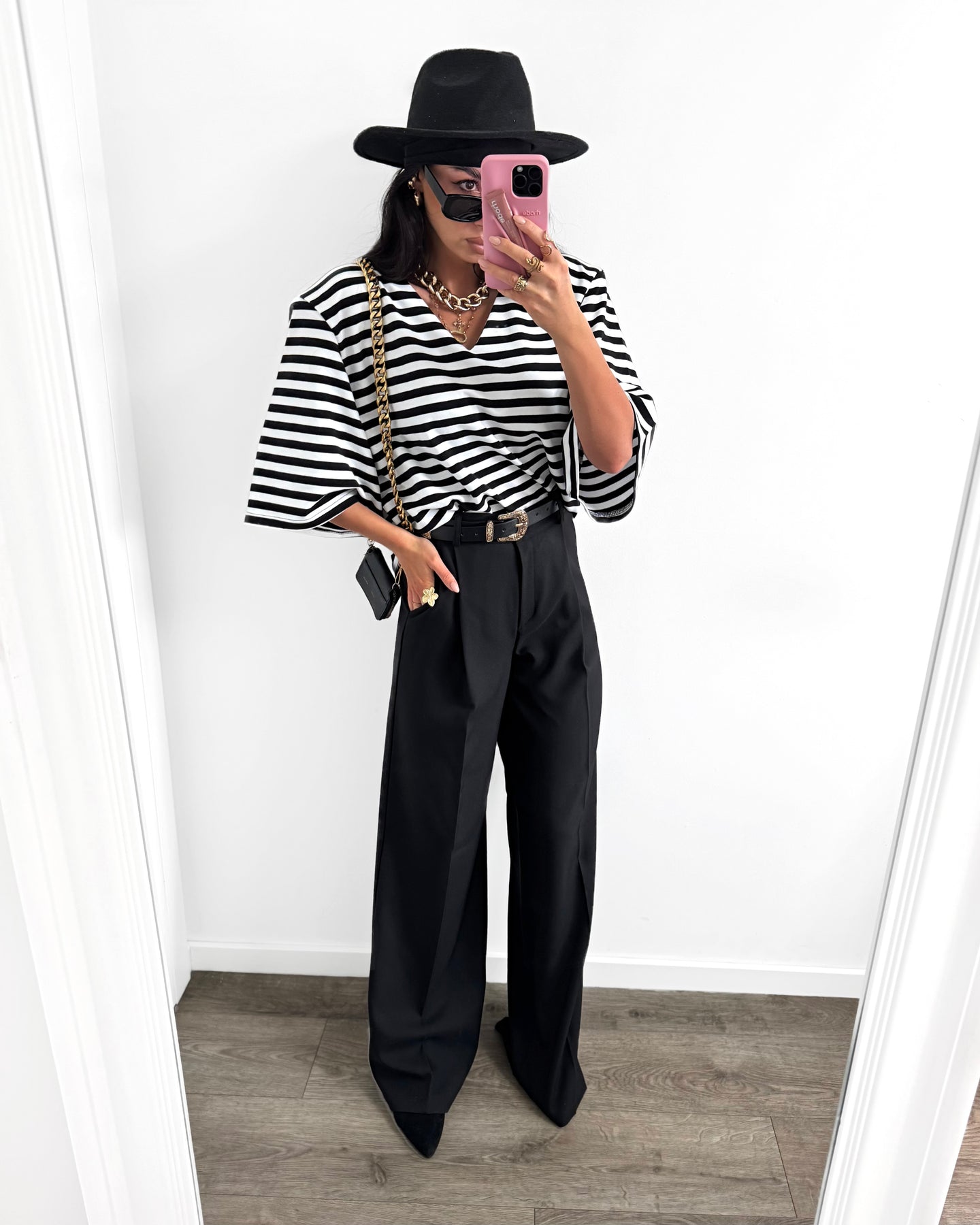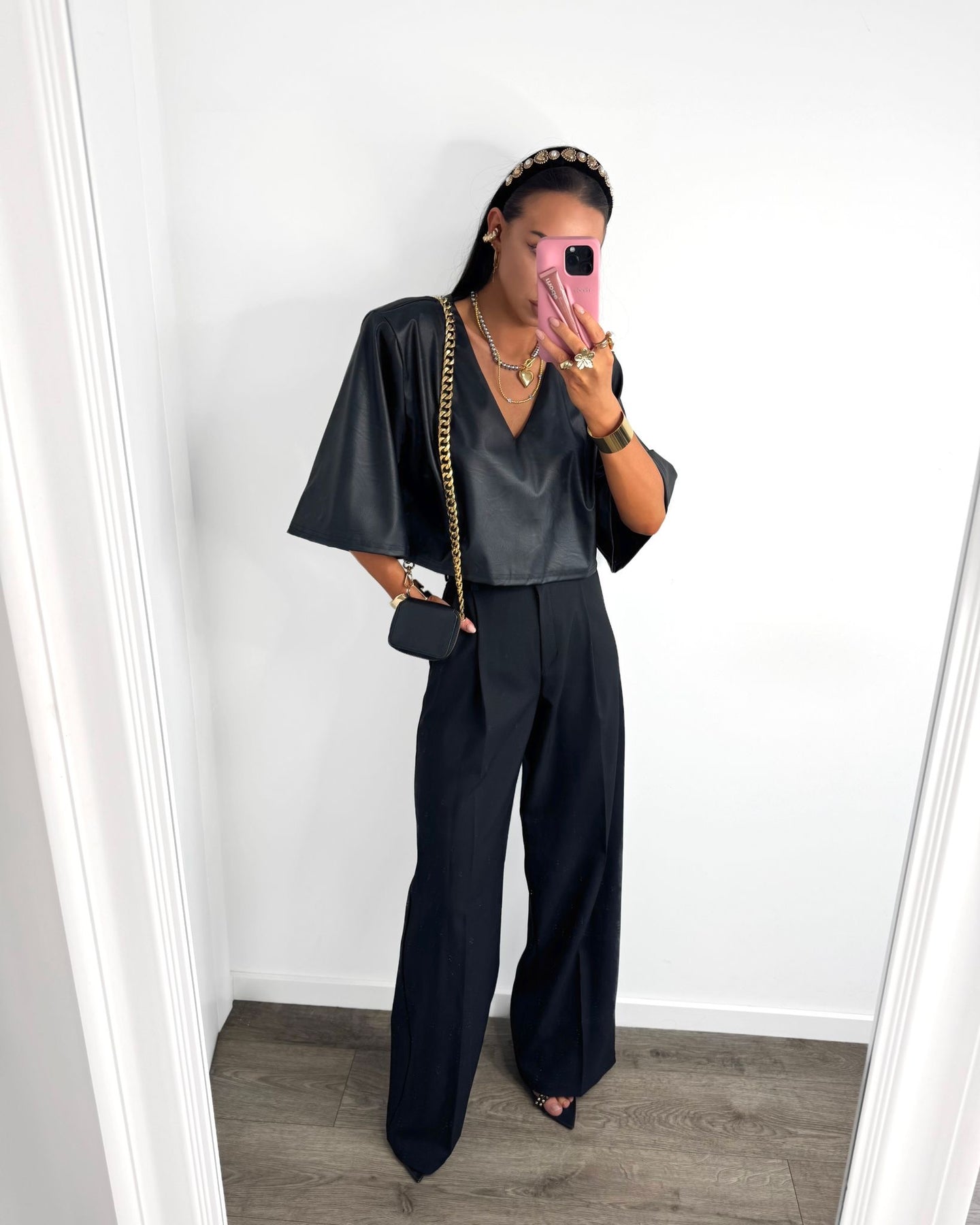 Elegantiškos plačios kelnės aukštu liemeniu – puikus pasirinkimas tiek darbui, tiek vakariniams deriniams. Klasikinis raštas suteikia subtilios prabangos, o laisvas siluetas garantuoja patogumą ir stilingą išvaizdą. Puikiai dera tiek su marškinėliais, tiek su elegantiškais švarkeliais ar palaidinėmis. Taip pat puikiai derės su mūsų eko odos palaidine.