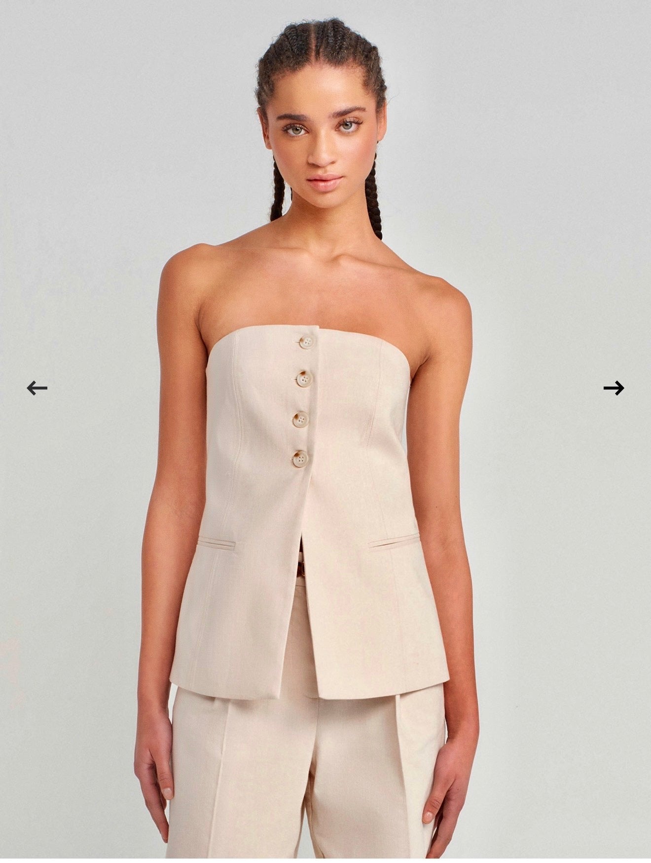 Šis elegantiškas dviejų dalių kostiumėlis išsiskiria moderniu minimalizmu ir subtilia prabanga.Viršutinė dalis – be petnešėlių, korseto tipo, dailiai priglundanti prie kūno, pabrėžianti pečių liniją ir iškirptę. Priekyje – dekoratyvinės sagos ir lengvas skeltukas, suteikiantis siluetui lengvumo bei išskirtinumo. Tvarkingos kišenės imitacijos detalės prideda klasikinio kostiumo charakterio.Kelnės – tiesaus, šiek tiek platėjančio kirpimo, aukštesniu liemeniu, kuris gražiai ištempia figūrą ir suteikia elegantišką proporciją. Audinys atrodo struktūriškas, tačiau lengvas, todėl kostiumėlis tinka tiek šiltajam sezonui, tiek sluoksniavimui. Sudėtis : 50% poliesteris, 30% viskozė, 17% linas, 3% elastanas