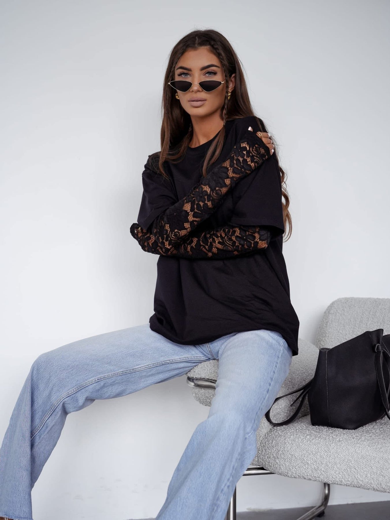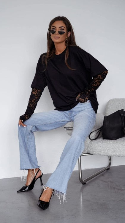 Juoda, stilinga oversized tipo palaidinė–marškinėliai, puikiai tinkantys moderniam, laisvam įvaizdžiui. Rankovės sluoksniuotos – po trumpomis marškinėlių rankovėmis matosi juodi nėriniai, suteikiantys įvaizdžiui išskirtinumo, moteriškumo ir lengvos dramos. Medžiaga minkšta, patogi, laisvai krentanti. Sudėtis : 95% medvilnė, 5% elastanas