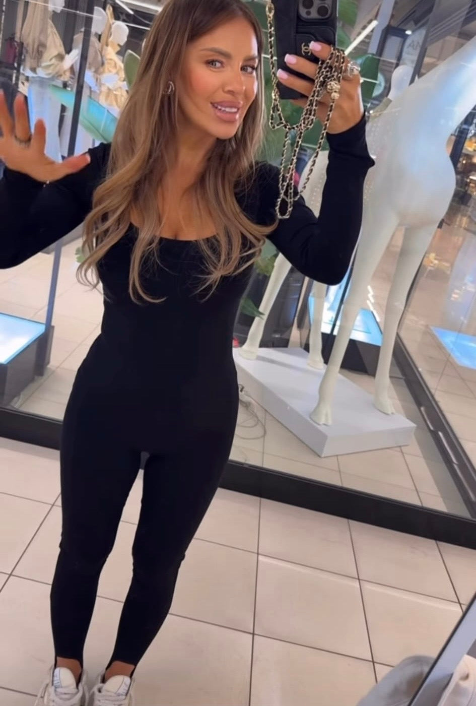 Šis juodos spalvos kombinezonas – itin stilingas ir figūrą pabrėžiantis pasirinkimas moteriai, vertinančiai minimalizmą ir eleganciją.Prigludęs siluetas gražiai išryškina kūno linijas, o kvadratinė iškirptė subtiliai akcentuoja dekoltė ir suteikia modernumo. Ilgos rankovės ir tamprus, prie kūno prisitaikantis audinys užtikrina komfortą bei patogumą visą dieną. Kombinezonas nevaržo judesių, todėl puikiai tinka tiek aktyvesnei dienai, tiek laisvalaikiui ar stilingam miesto įvaizdžiui.Lengvai derinamas su sportiniais bateliais kasdieniam look’ui arba su švarku ir aulinukais – elegantiškesniam deriniui.