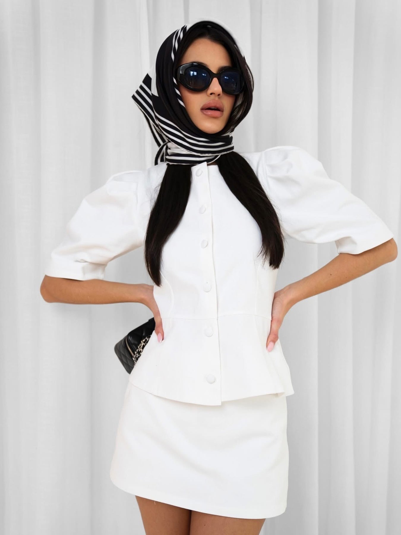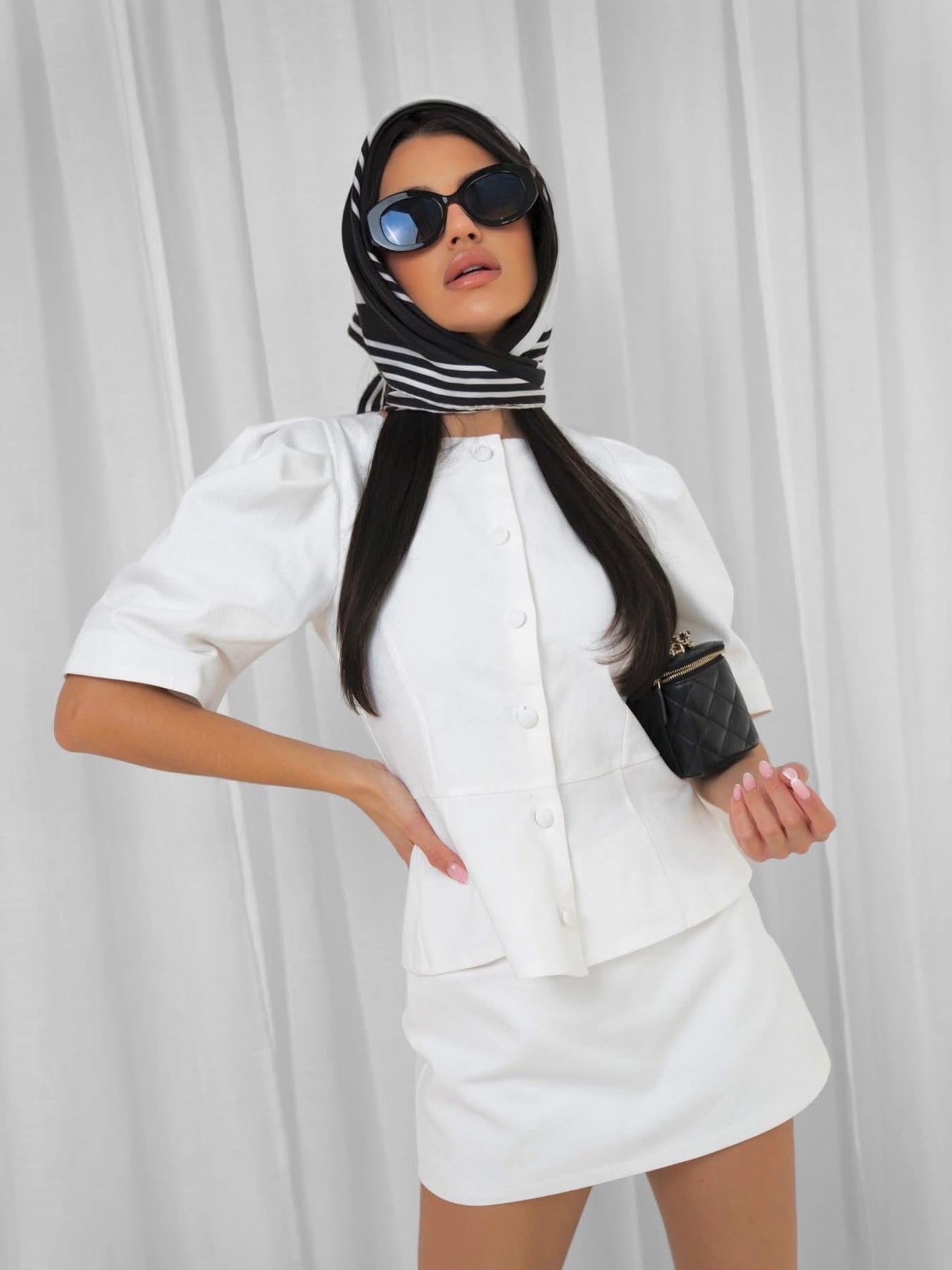 Modernus ir itin moteriškas kostiumėlis, sukurtas stilingam miesto įvaizdžiui. Struktūruota viršutinė dalis su subtiliai formuotais pečiais ir dekoratyviomis sagomis pabrėžia liemenį, o lengvai platėjanti apačia suteikia siluetui elegancijos. Komplektą papildo sijonas–šortai, kurie išlaiko sijono estetiką, tačiau užtikrina maksimalų komfortą ir judėjimo laisvę. Puikus pasirinkimas tiek kasdienai, tiek progoms, kai norisi atrodyti išskirtinai. Sudėtis : 100% medvilnė