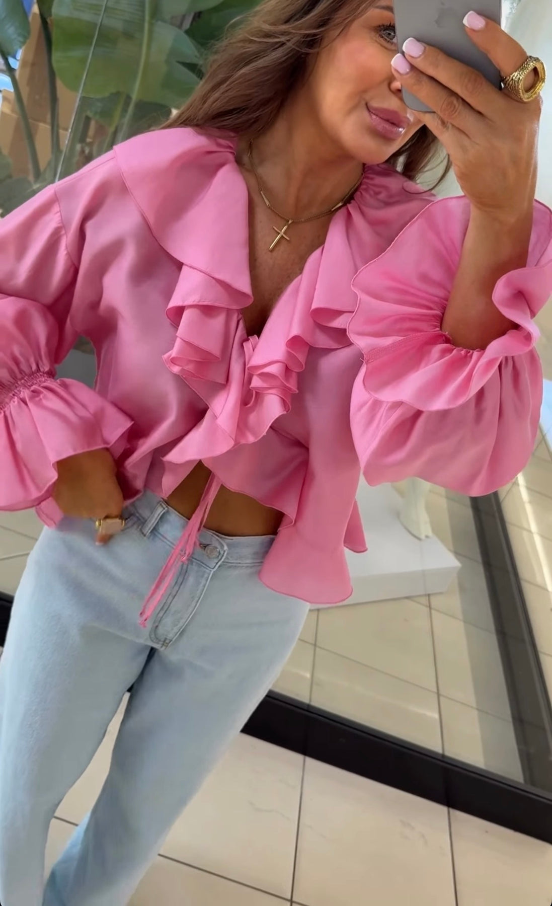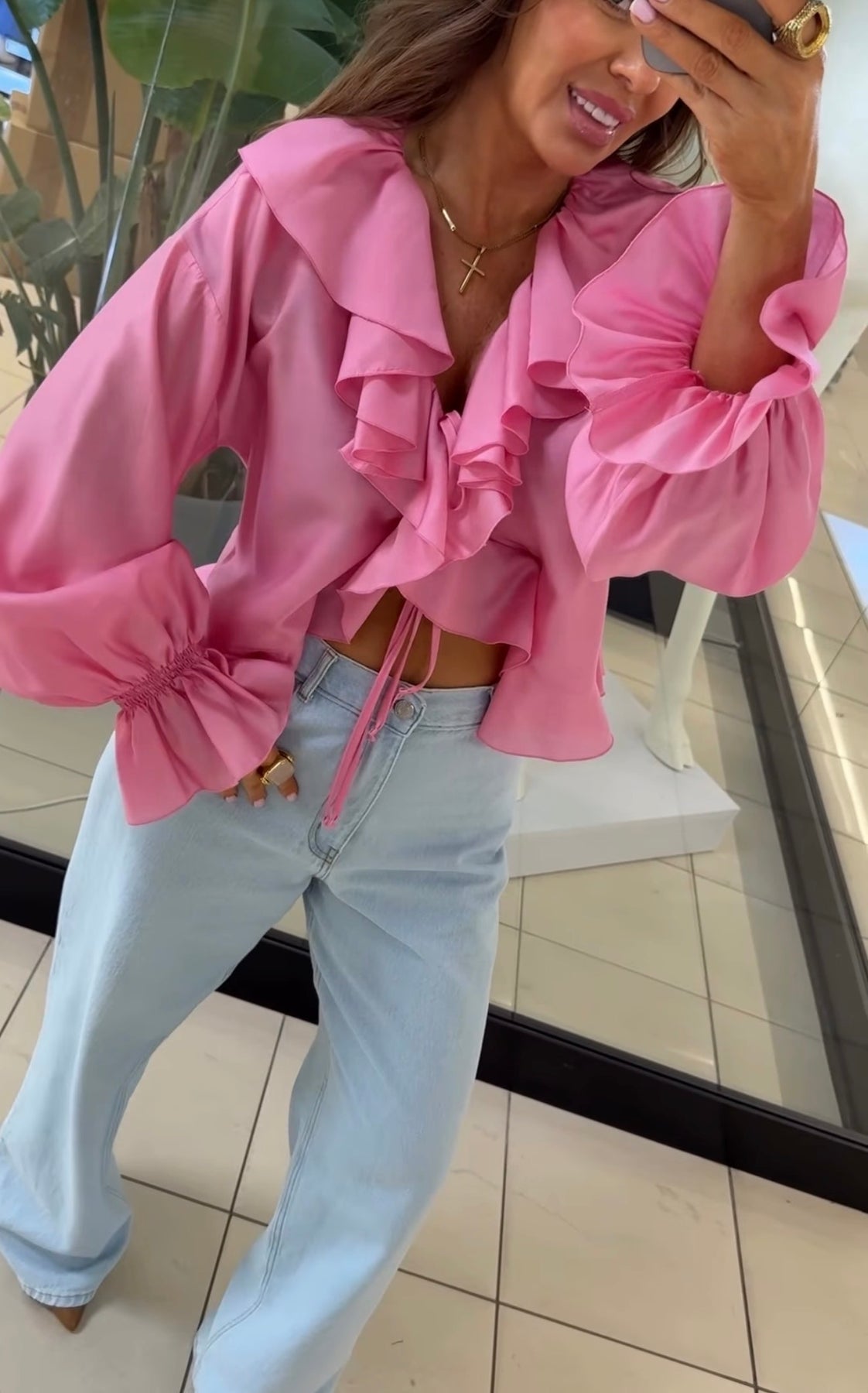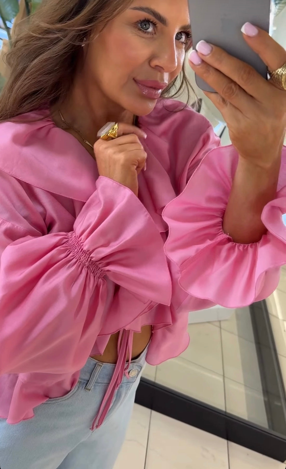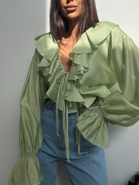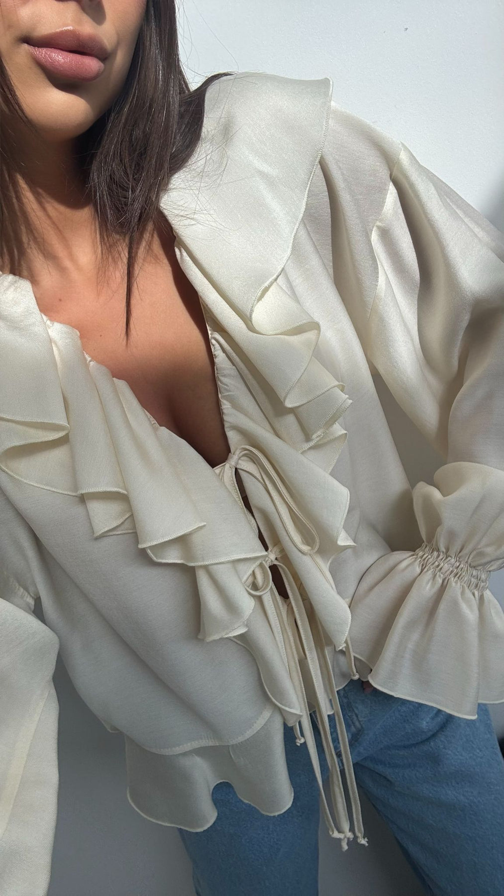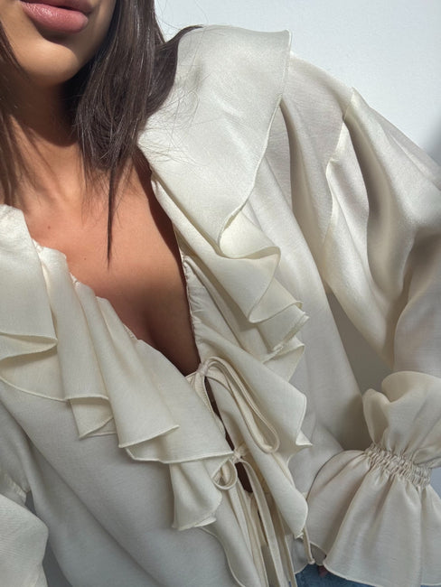 Lengvo, krentančio audinio palaidinė su išraiškingomis romantiškomis detalėmis. Modelis dekoruotas gausiomis raukinių juostomis priekyje, kurios subtiliai įrėmina iškirptę ir suteikia elegancijos bei moteriškumo. Priekyje – reguliuojami raišteliai, leidžiantys pritaikyti iškirptės gylį pagal norimą stilių.Rankovės ilgos, lengvai pūstos, su sutrauktomis rankogalių detalėmis, kurios sukuria lengvumo ir švelnaus dramatiškumo efektą. Siluetas laisvesnis, tačiau lengvai formuojamas, todėl palaidinė gražiai krenta ant kūno ir tinka tiek kasdieniams, tiek išskirtiniams deriniams. Sudėtis :