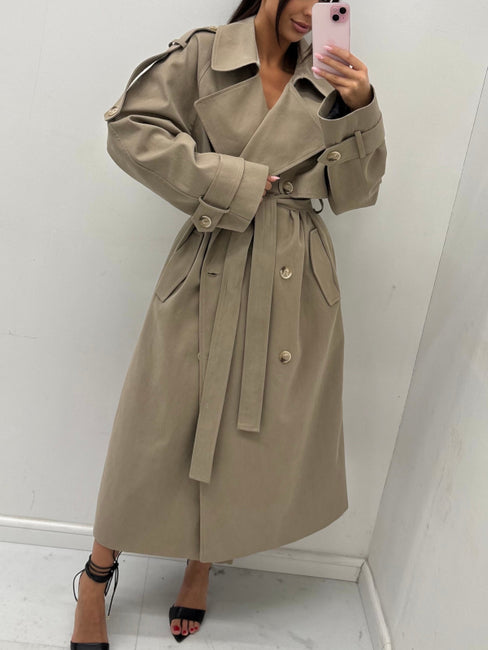 Klasikinis ilgas trench paltas – laikui nepavaldus garderobo akcentas, suteikiantis įvaizdžiui elegancijos ir rafinuotumo. Dvigubo užsegimo dizainas, plati apykaklė ir dekoratyvios sagos kuria autentišką trench stilių. Reguliuojamas liemuo su diržu leidžia pabrėžti figūrą, o struktūruotas audinys gražiai krenta ir išlaiko formą. Puikiai tinka tiek kasdieniams miesto deriniams, tiek elegantiškiems išėjimams. Sudėtis : 70% medvilnė, 30% viskozė.