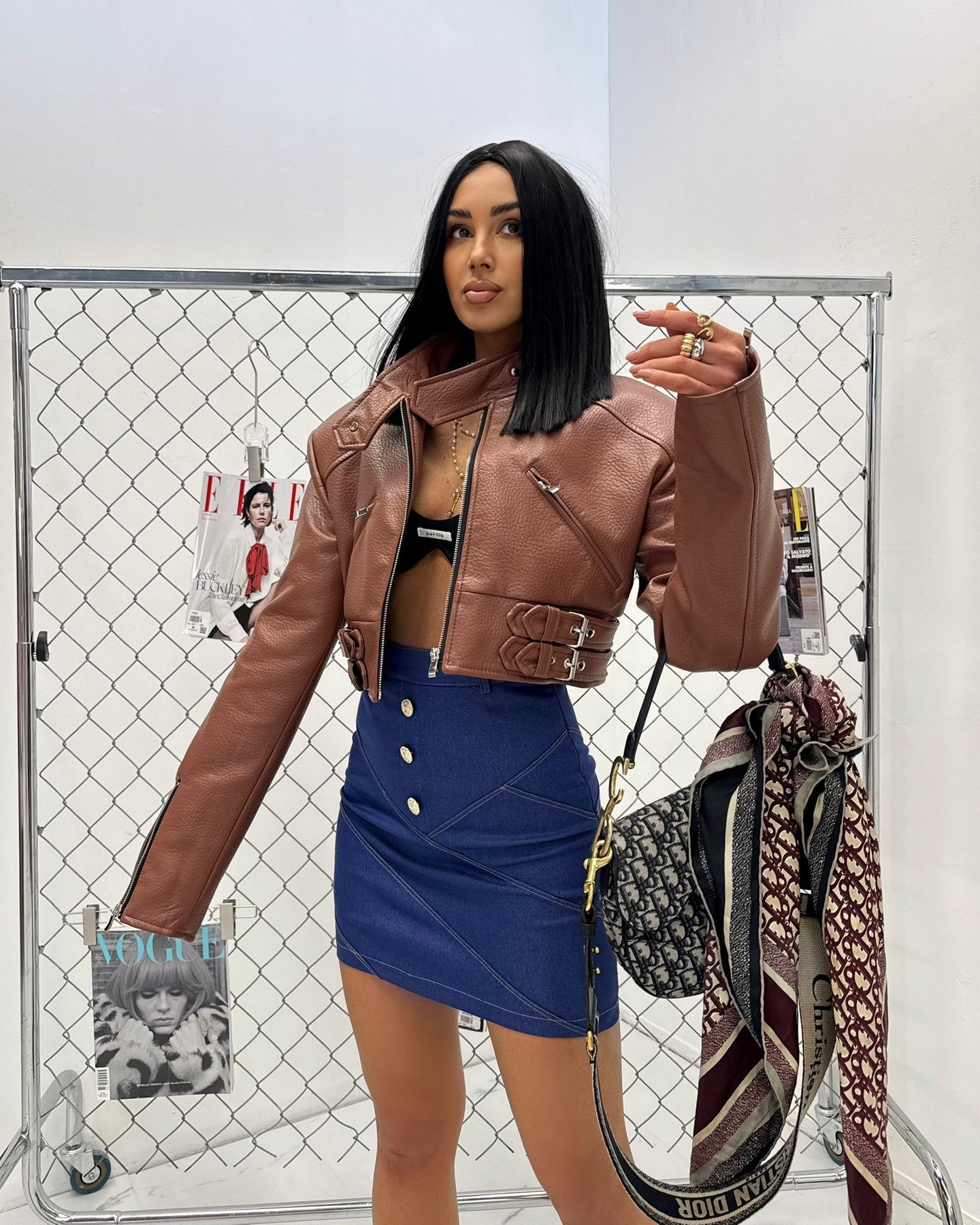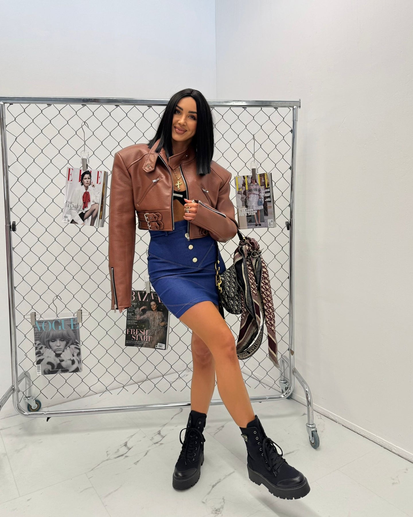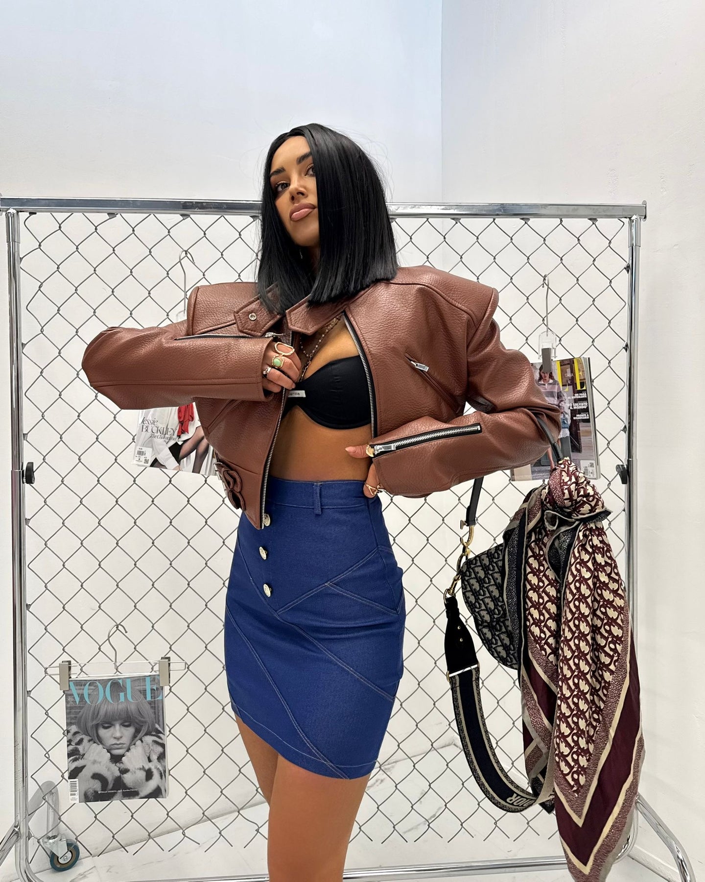 Modernus, figūrą pabrėžiantis mini sijonas, kuris akimirksniu suteikia įvaizdžiui charakterio. Aukštas liemuo ir struktūruotas kirpimas gražiai formuoja siluetą, o dekoratyvinės siūlės bei auksinės sagos suteikia išskirtinumo. Puikiai tinka tiek kasdieniam miesto stiliui, tiek vakariniam deriniui su aukštakulniais ar ilgaauliais batais.