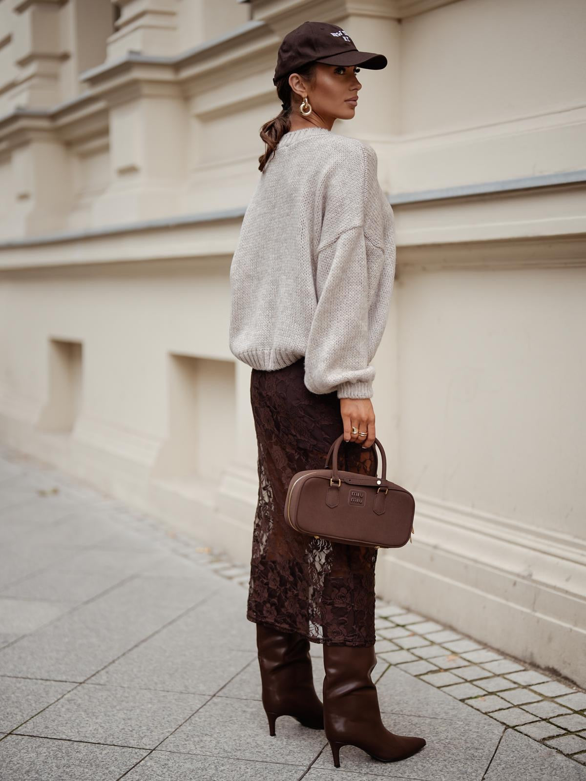 Šis sijonas – tikras akcentas tavo garderobe. Jis pasiūtas iš prabangaus nėriniuoto audinio su gėlių motyvais, kurie suteikia romantikos ir subtilaus žavesio. Pamušalas iki šlaunų užtikrina patogumą ir leidžia elegantiškai atsiskleisti nėriniui per visą sijono ilgį. Vidutinio ilgio kirpimas ir šiek tiek prigludęs siluetas dailiai pabrėžia figūrą. Puikiai derės su mūsų megztuku “Karmen”. Uni dydis tinkams XS/S/M
