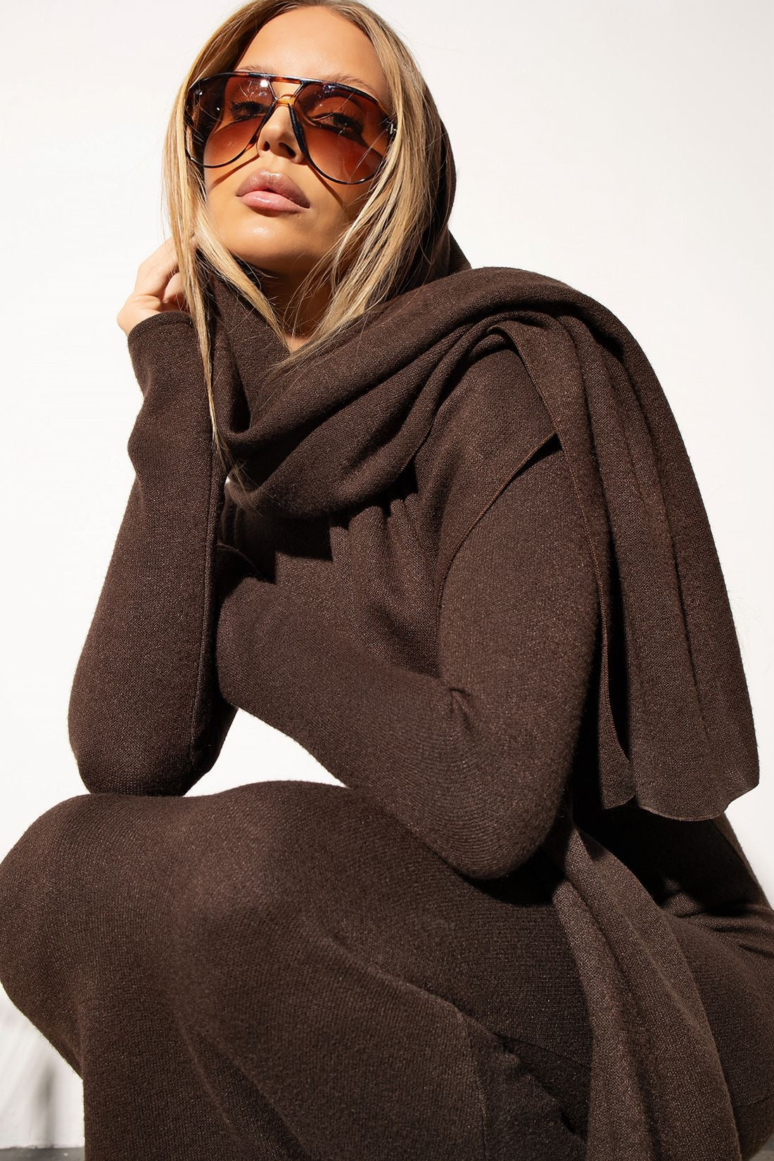 Elegantiška, kūną dailiai apgaubianti megzta suknelė, pasižyminti švelnia, tampria ir malonia audinio tekstūra. Tamsiai rudas atspalvis kuria šiltą, prabangią estetiką, o ilgas siluetas optiškai lieknina ir suteikia grakštumo.Suknelė turi aukštą golfą su priderintu krintančiu gobtuvu/šalikėliu, kurį galima įvairiai stilizuoti. Nugara atvira – subtili, moteriška detalė, kuri išlaiko suknelės modernumą. Ilgos rankovės ir priglundanti forma suteikia komforto bei elegancijos jausmą.Puikus pasirinkimas tiek kasdienai, tiek ypatingoms progoms derinant su aulinukais ar aukštakulniais. Sudėtis : 3”45% rayon, 36% poliesteris, 19% nailonas