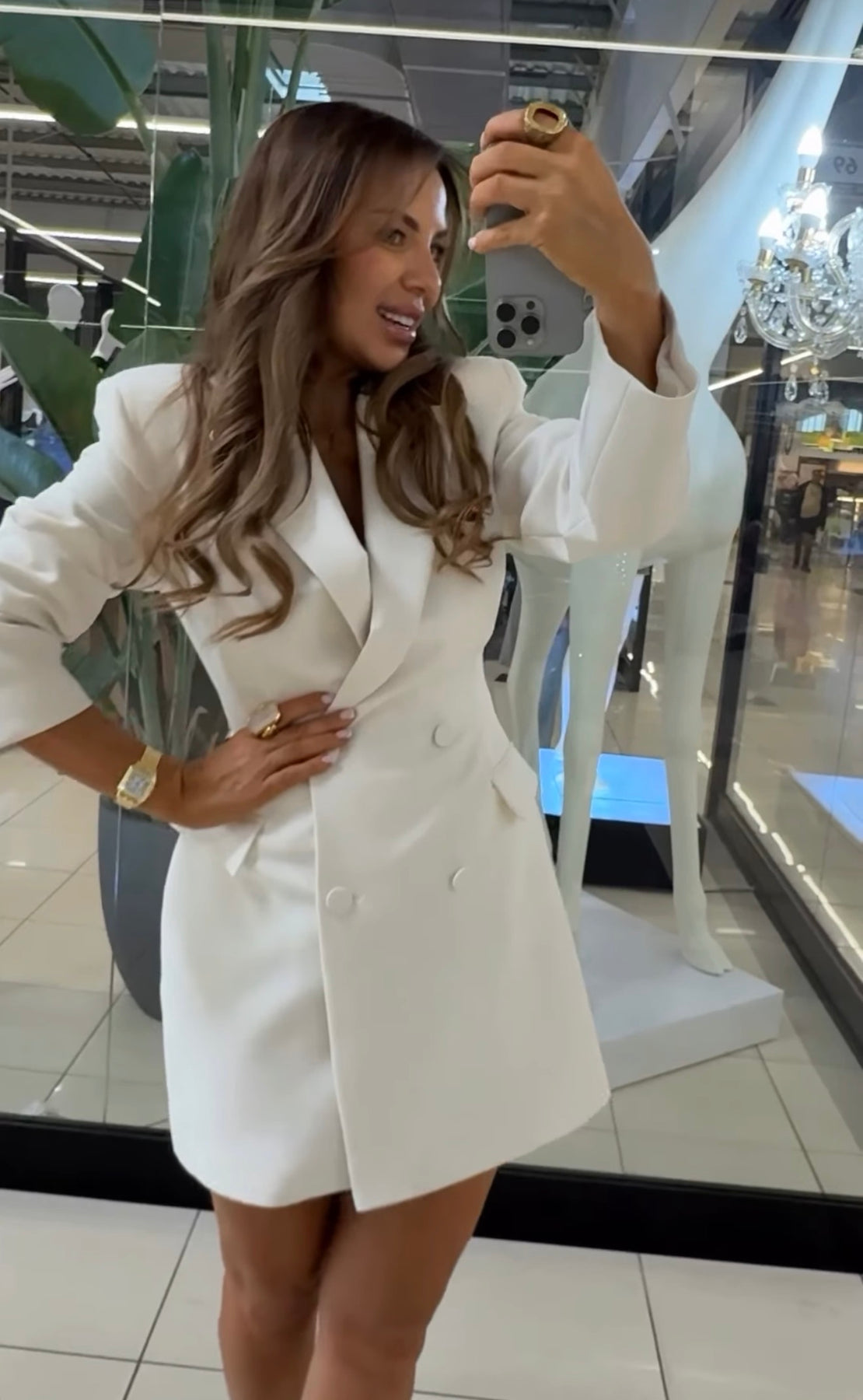Elegantiškas švarko tipo suknelės modelis, pasižymintis struktūruotu siluetu ir subtiliai pabrėžta talija. Dvigubo užsegimo dizainas su dekoratyvinėmis sagomis suteikia klašišos ir modernumo balansą, o gili V formos iškirptė vizualiai ilgina kaklą bei kuria rafinuotą įvaizdį.Pečių linija struktūruota, suteikianti laikysenai tvirtumo ir elegancijos, o tiesaus kirpimo rankovės išlaiko švarų, minimalistinį siluetą. Modelį papildo kišenes imituojančios detalės, kurios subtiliai akcentuoja klubų liniją. Trumpas ilgis išryškina kojas, todėl šis modelis puikiai tinka tiek vakariniams deriniams su aukštakulniais, tiek dienai – derinant su minimalistiniais aksesuarais. Tai universalus, stilingas pasirinkimas moteriai, vertinančiai modernią klasiką.