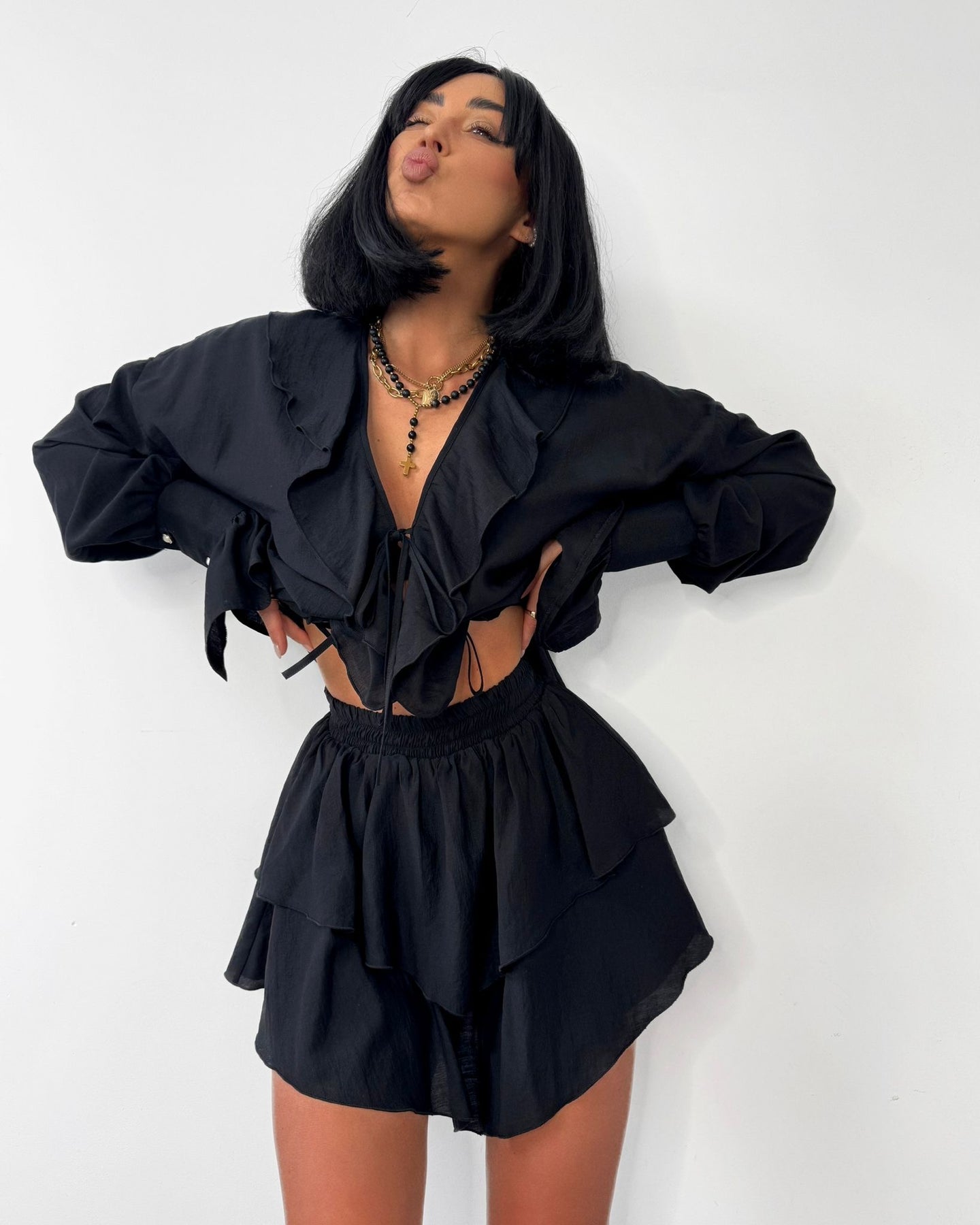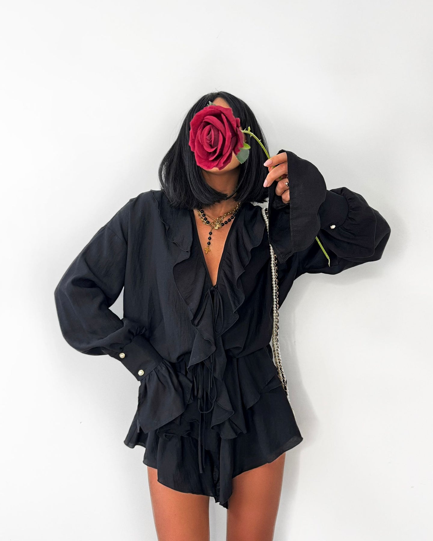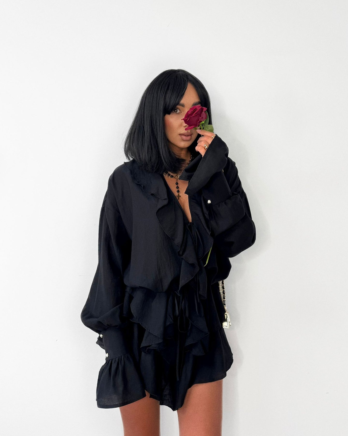 Šie marškiniai – išskirtinai moteriški ir žaismingi, pasižymintys romantiškomis detalėmis bei subtiliu prabangos pojūčiu. Juodos spalvos audinys lengvai krenta ir suteikia įvaizdžiui elegancijos, o išryškinti raukiniai priekyje bei rankogaliuose sukuria ypatingą judesio ir lengvumo efektą.Modelis laisvo silueto, su ilgesnėmis, plačiomis rankovėmis ir perliukais puoštomis sagomis. Šie marškiniai idealiai dera tiek su sijonais ar šortais, tiek dėvimi kaip komplekto dalis, kuriant rafinuotą, vakarui tinkantį „total black“ įvaizdį.Stilingi, drąsūs ir kartu subtiliai moteriški – tobuli vakariniams pasimatymams ar miesto išėjimams. Sudėtis : 100% viskozė