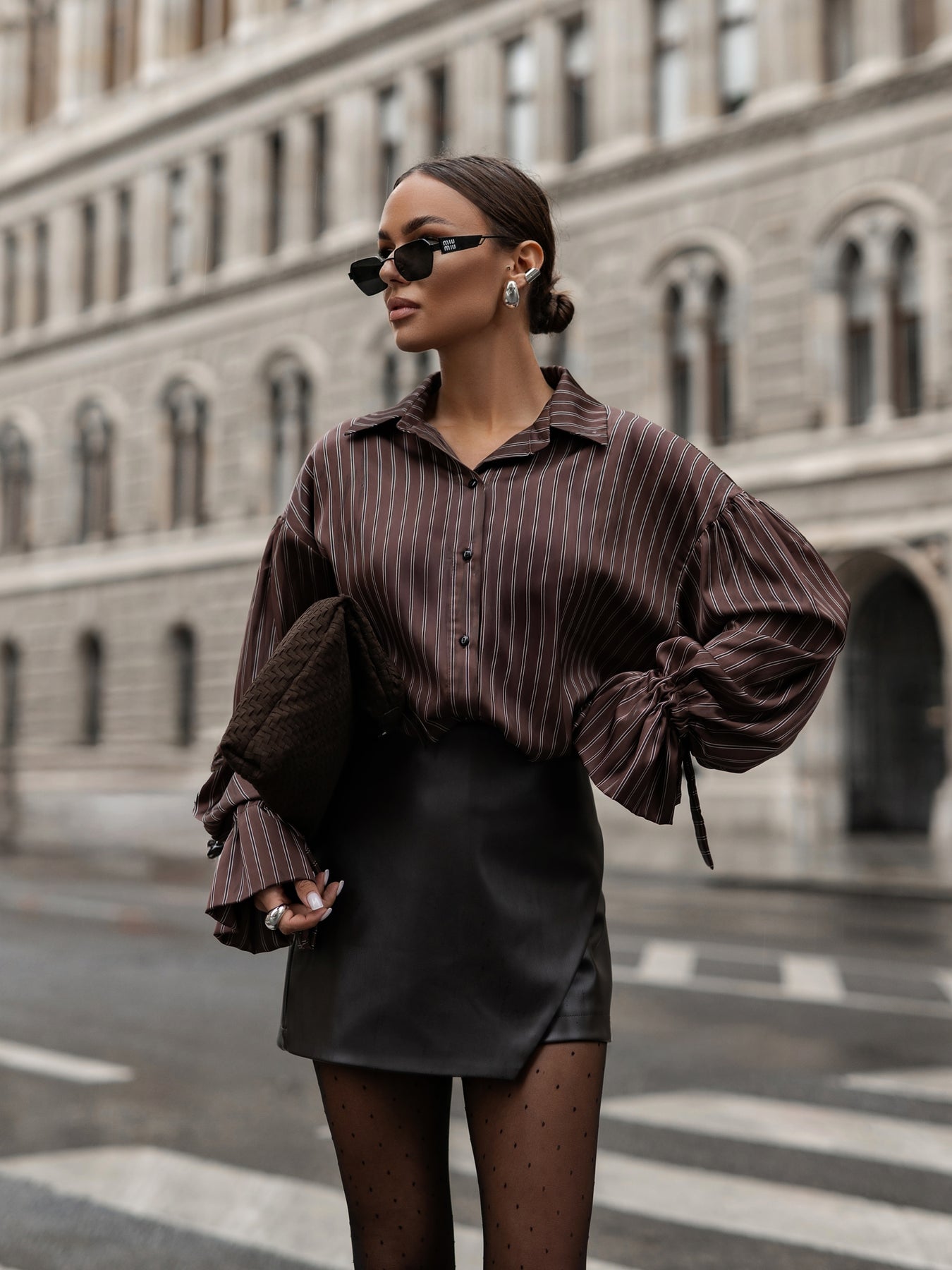 Elegantiški rudos spalvos dryžuoti marškiniai – stilingas pasirinkimas tiek kasdienai, tiek vakariniam įvaizdžiui. Laisvo kirpimo modelis nevaržo judesių, o plačios rankovės su kaspinais riešuose suteikia išskirtinumo ir moteriškumo. Lengvas, krintantis audinys maloniai priglunda prie kūno, o vertikalūs dryžiai optiškai ilgina siluetą. Puikiai dera su odiniu sijonu ar kelnėmis. 100% poliesteris