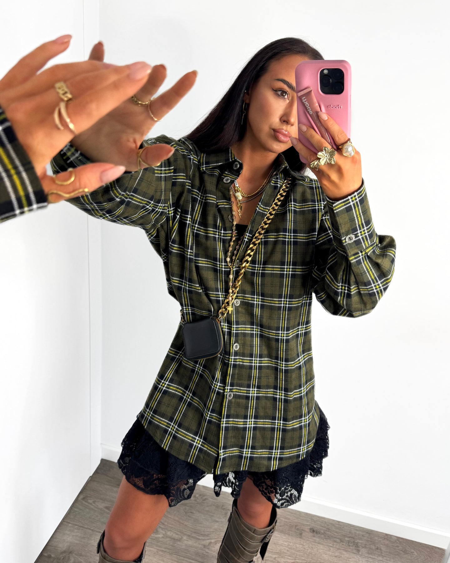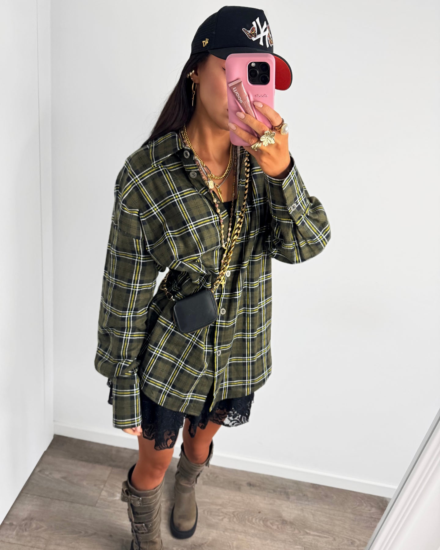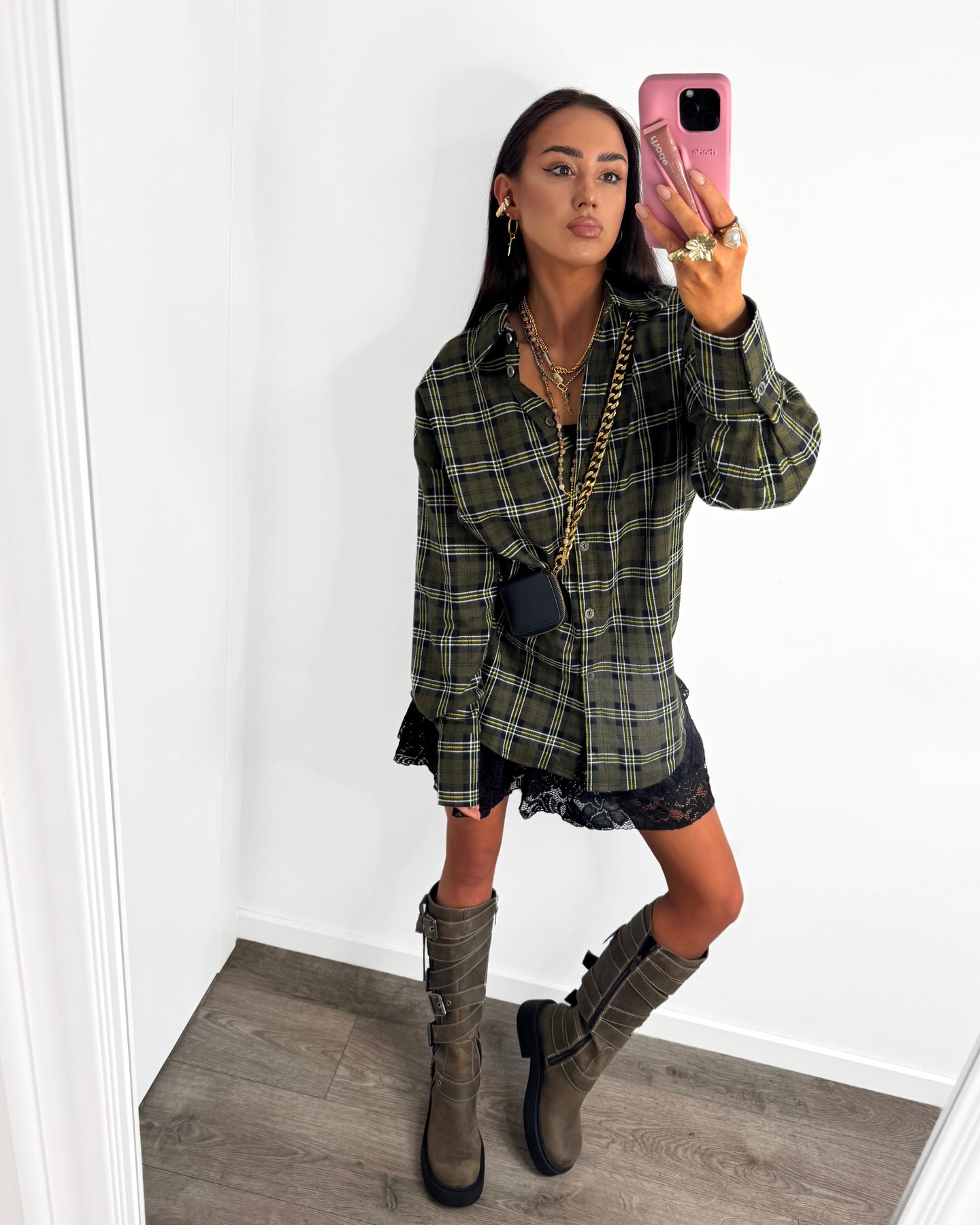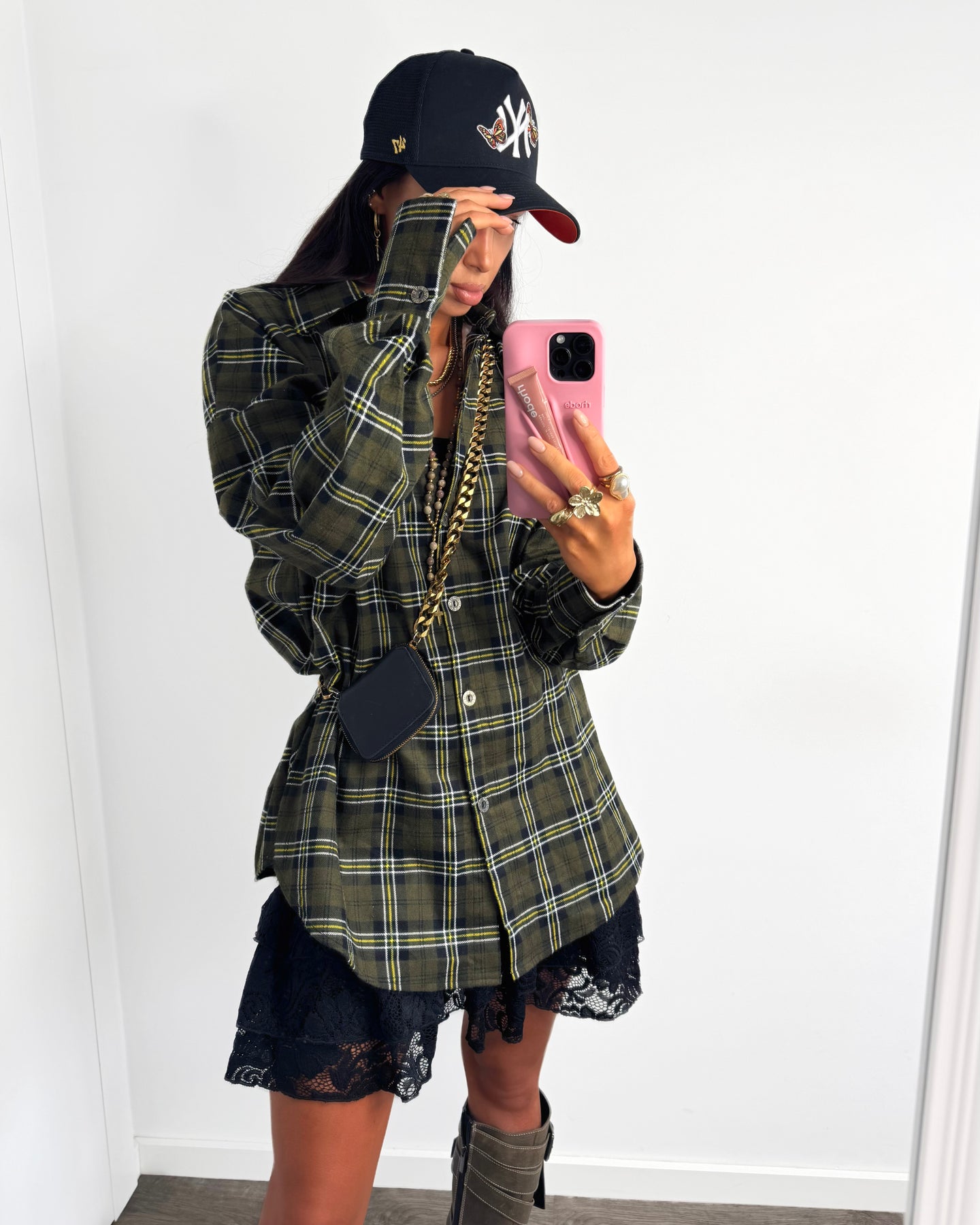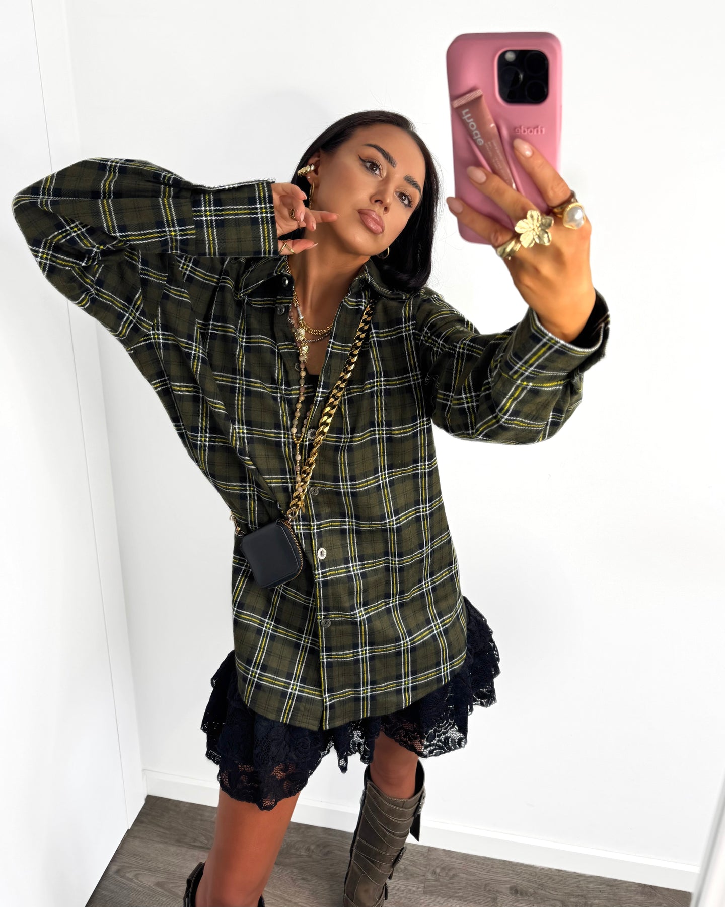 Stilingi, laisvo kirpimo marškiniai su klasikiniu languotu raštu. Tamsiai žalia, juoda ir balta spalvų paletė suteikia universalaus derinimo galimybių – puikiai tinka tiek prie džinsų, tiek sluoksniuoti ant suknelės ar šortų. Ilgesnis modelis bei „oversized“ siluetas suteikia modernumo ir komforto jausmą. Užsegami sagomis per visą ilgį, su ilgomis rankovėmis. Sudėtis : 100% medvilnė