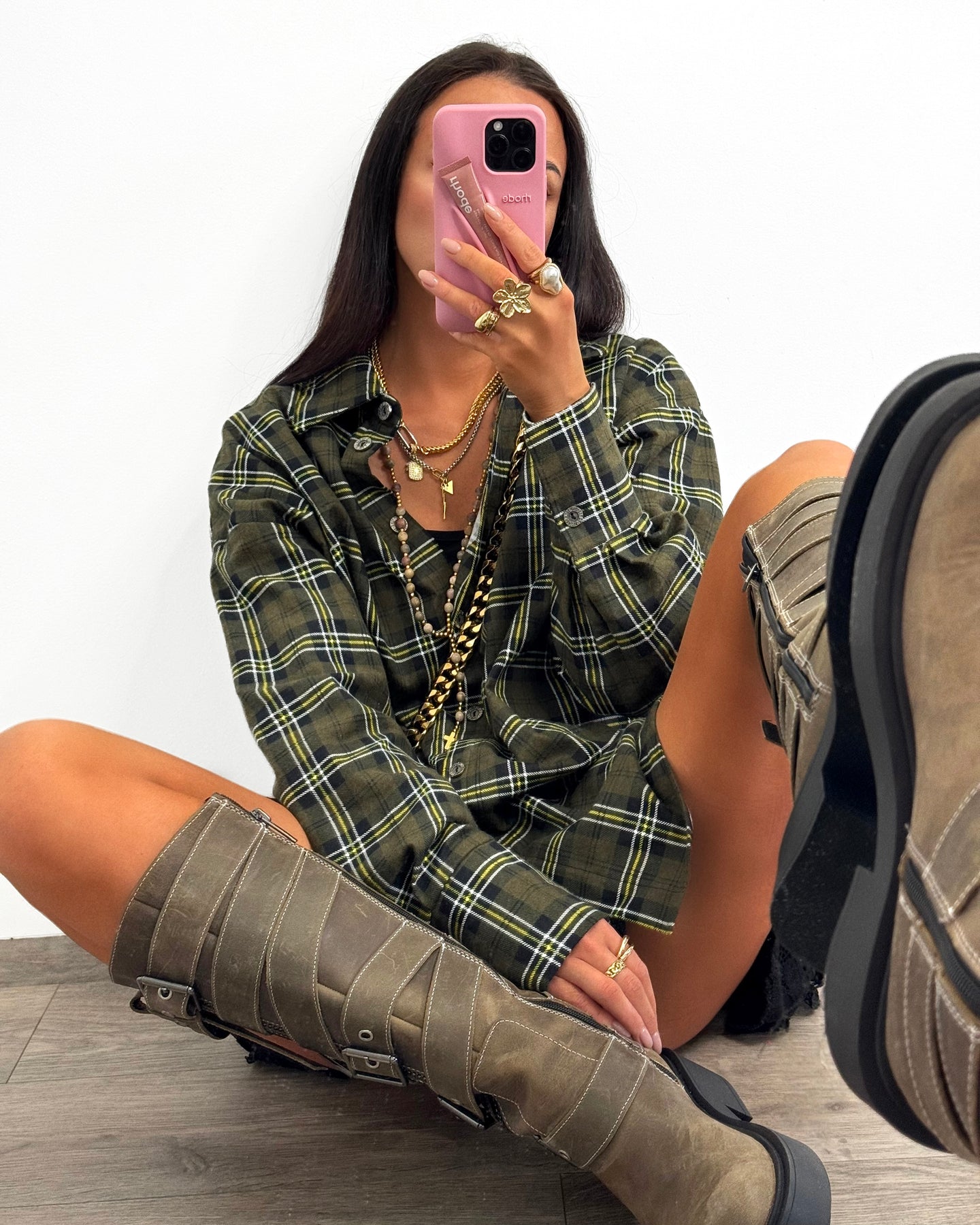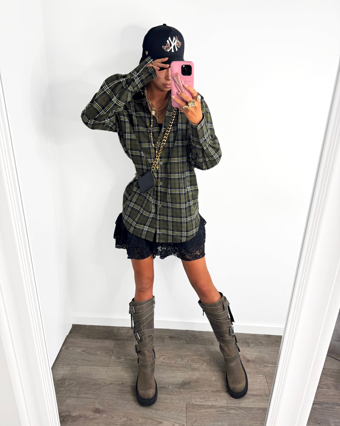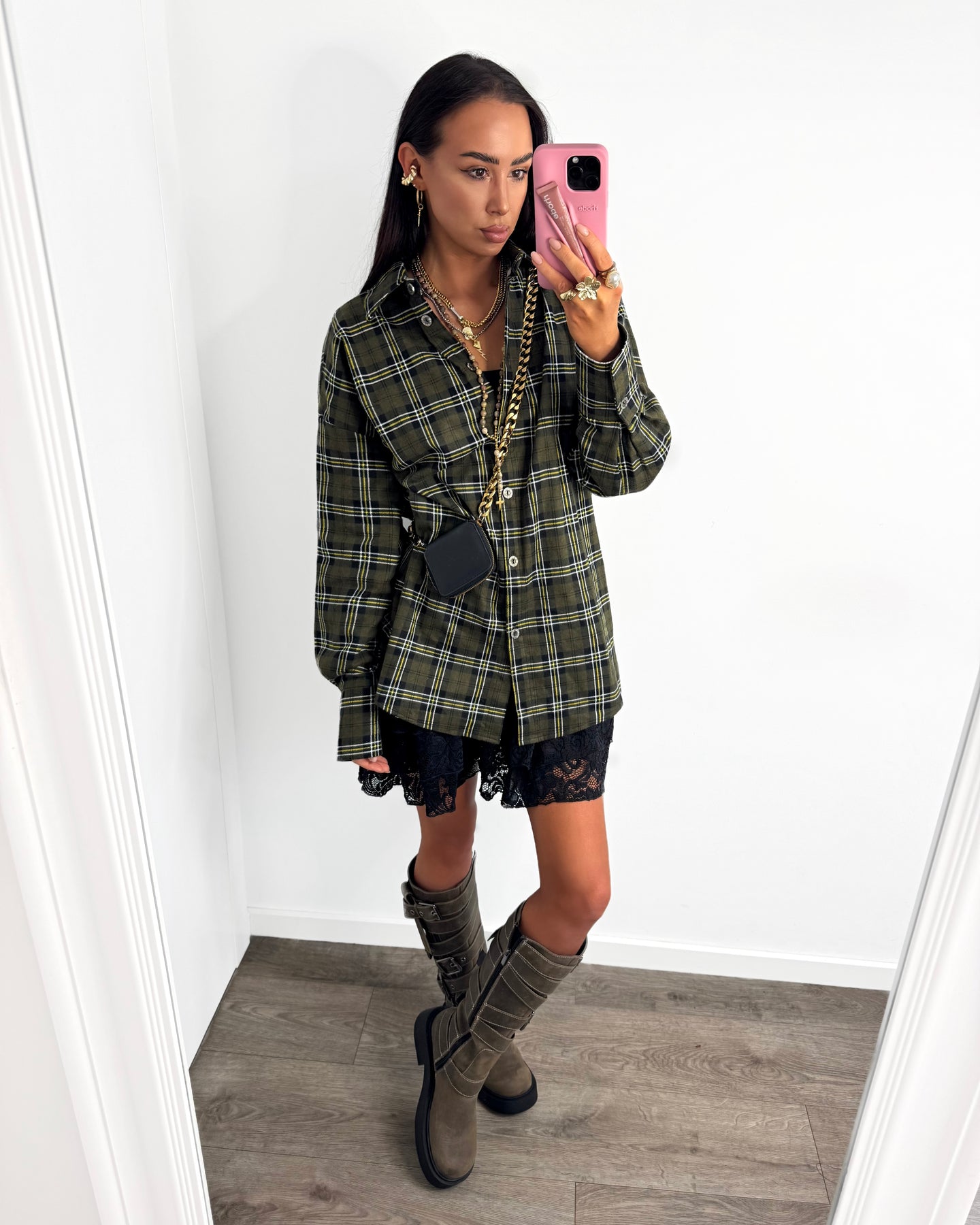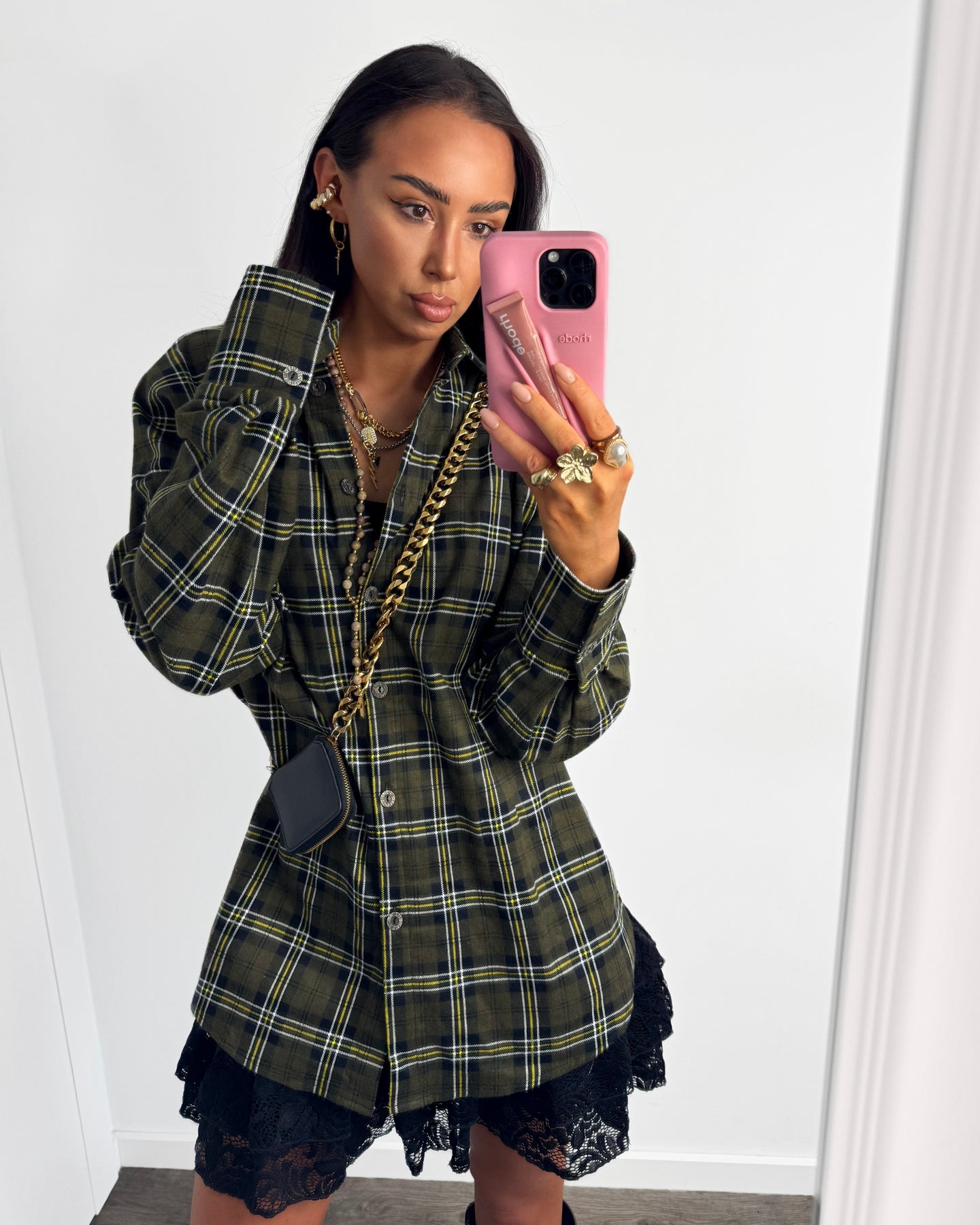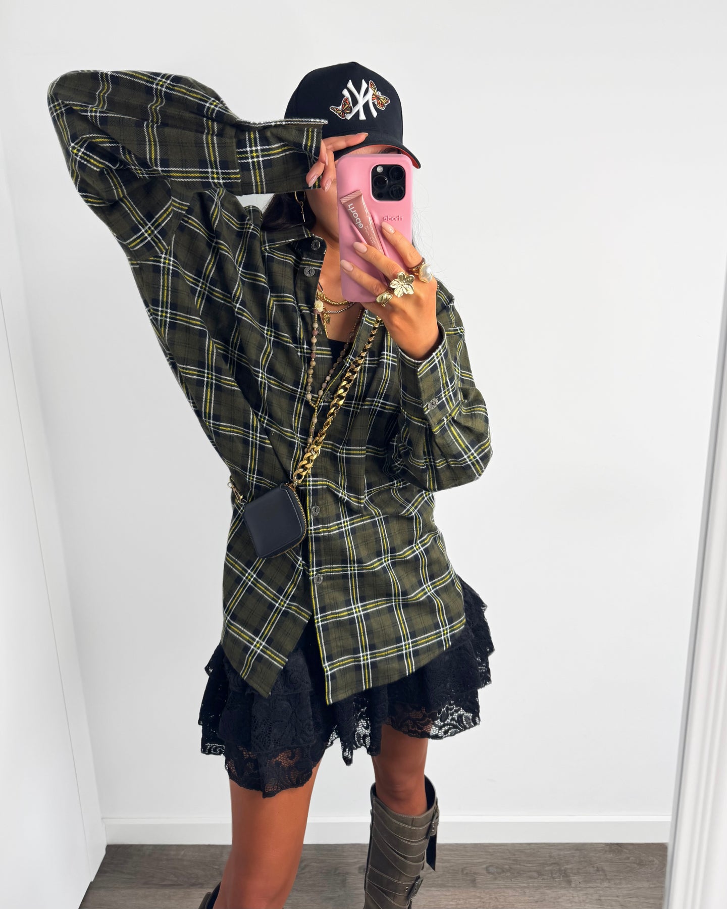 Stilingi, laisvo kirpimo marškiniai su klasikiniu languotu raštu. Tamsiai žalia, juoda ir balta spalvų paletė suteikia universalaus derinimo galimybių – puikiai tinka tiek prie džinsų, tiek sluoksniuoti ant suknelės ar šortų. Ilgesnis modelis bei „oversized“ siluetas suteikia modernumo ir komforto jausmą. Užsegami sagomis per visą ilgį, su ilgomis rankovėmis. Sudėtis : 100% medvilnė