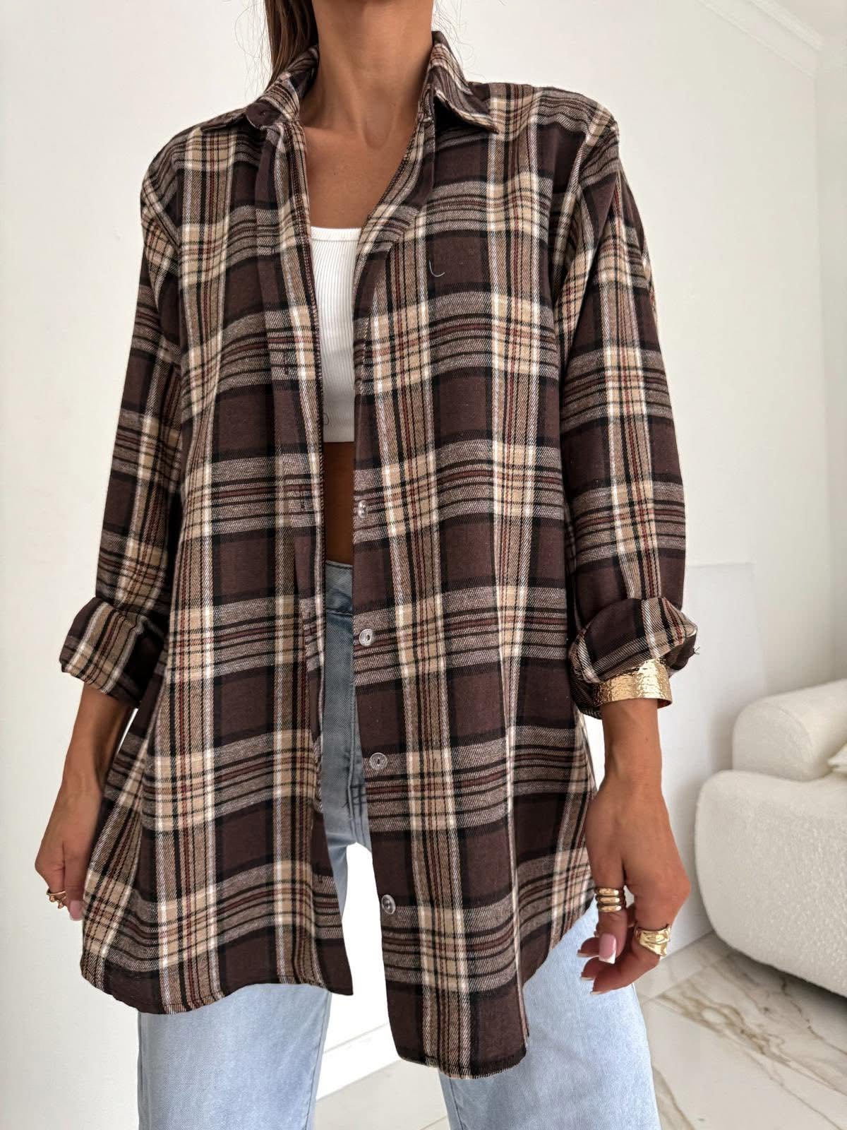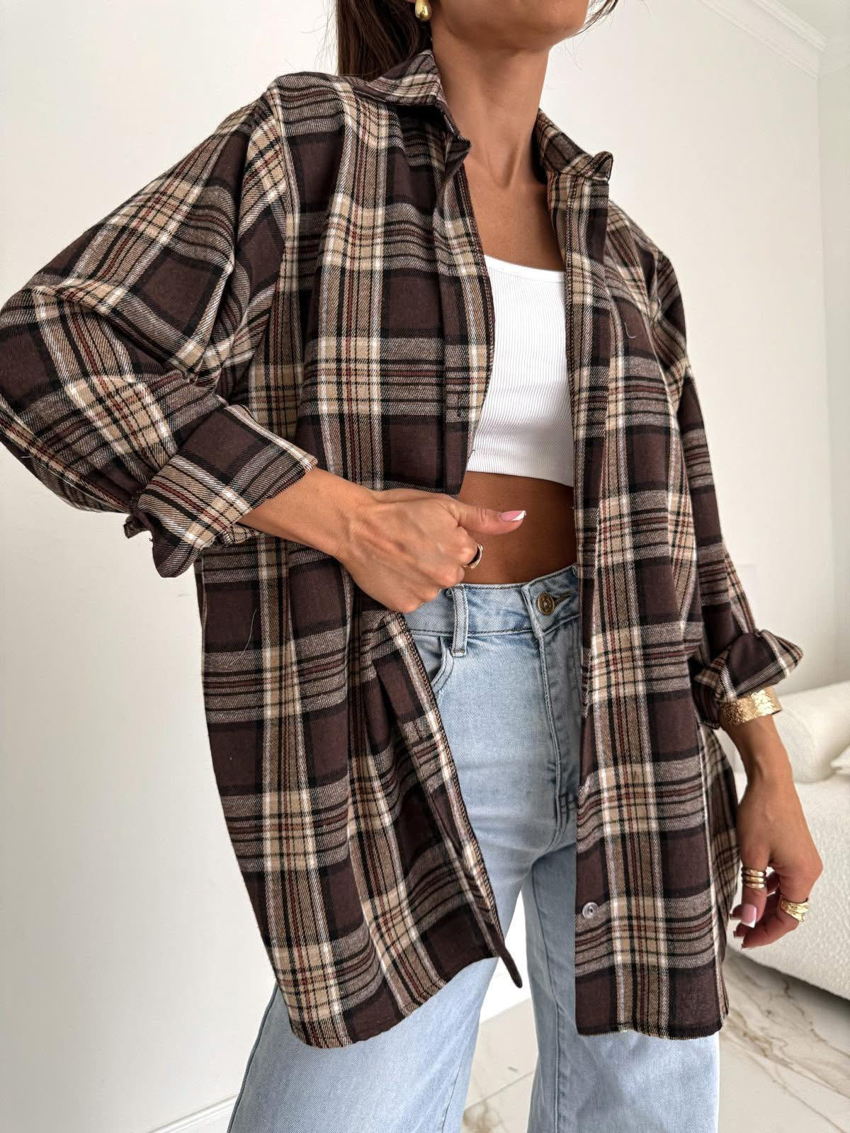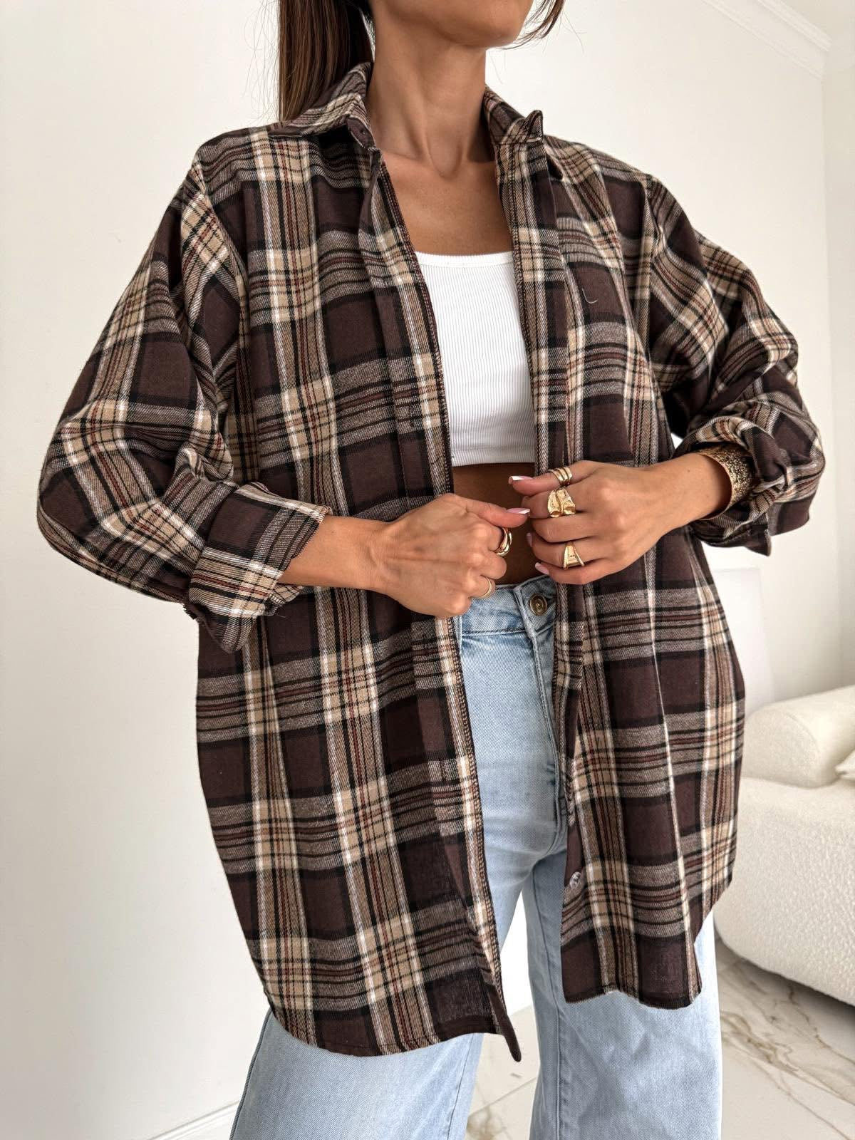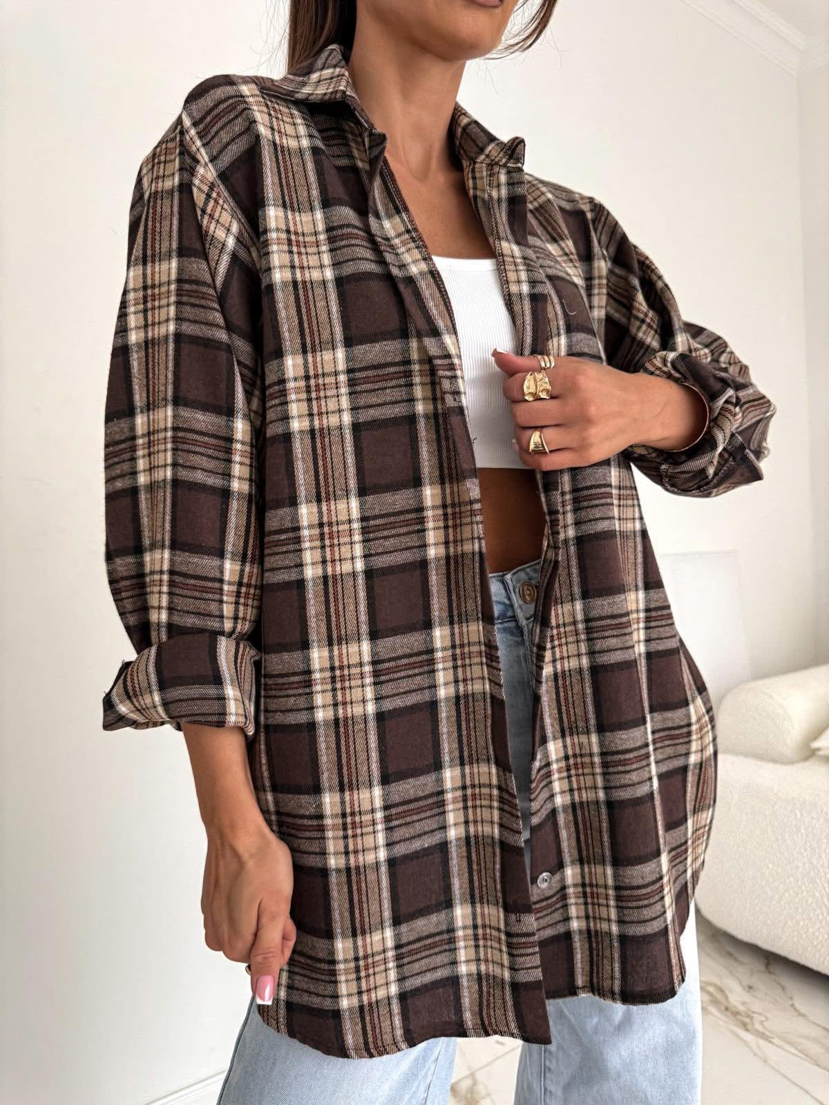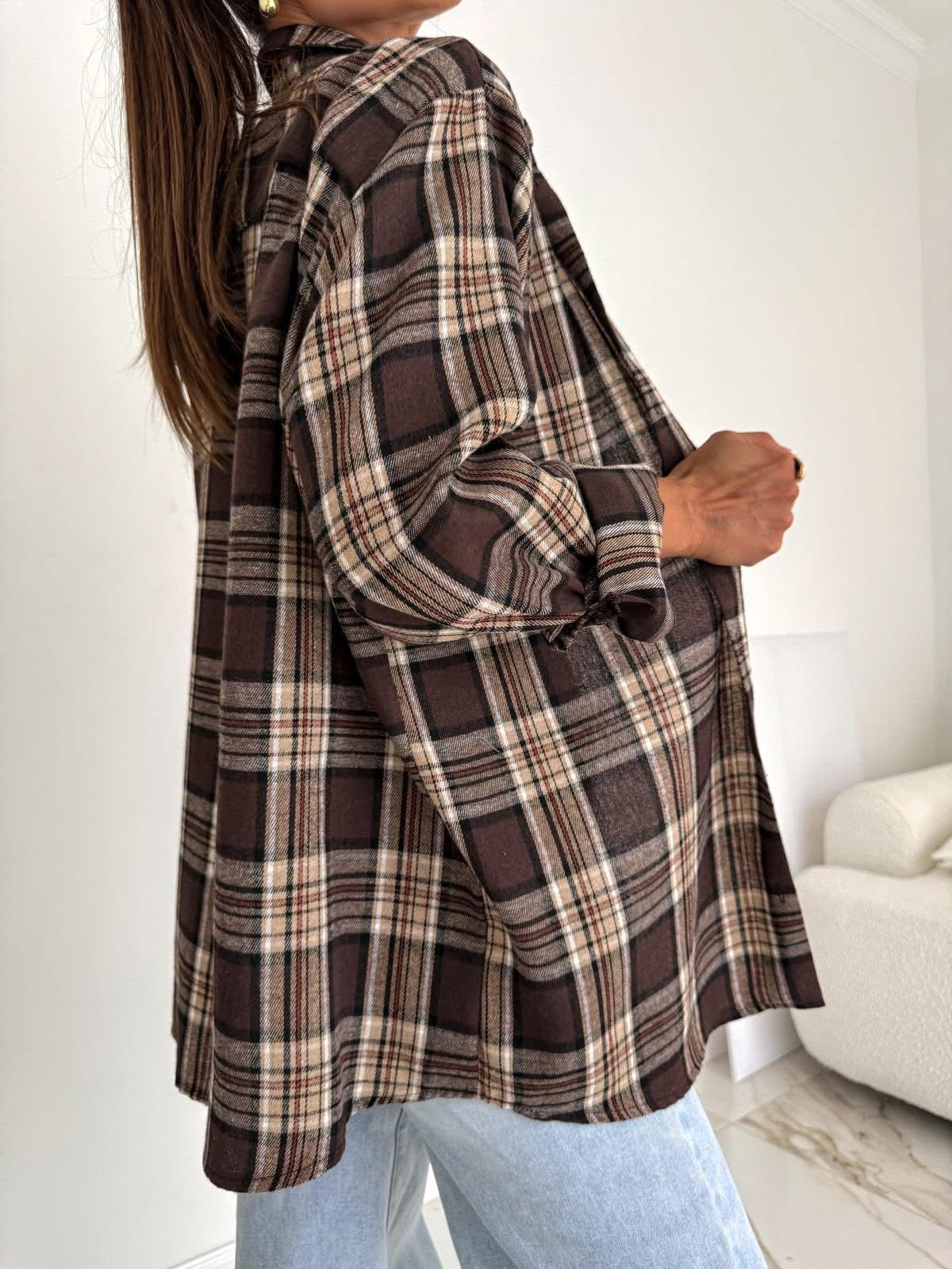 Šie marškiniai – tai stilingas, laisvo silueto  modelis, puikiai tinkantis tiek rudeniui, tiek vėsesnėms vasaros dienoms. Audinys minkštas, jaukus ir malonus prie kūno, o dominuojantis tamsiai rudas atspalvis derinamas su smėlio, kreminiais ir juodais langeliais, kurie suteikia klasikiniam raštui modernumo.Modelis šiek tiek oversize, todėl atrodys puikiai tiek su džinsais, tiek užmestus ant tamprės ar paprasto baltos spalvos top‘o. Marškiniai turi ilgintas rankoves, kurias galima stilingai pasiraitoti, ir tradicinę apykaklę. Universalus, lengvai derinamas ir suteikiantis jaukų, „casual chic“ įvaizdį. Sudėtis : 65% poliesteris, 35% medvilnė.