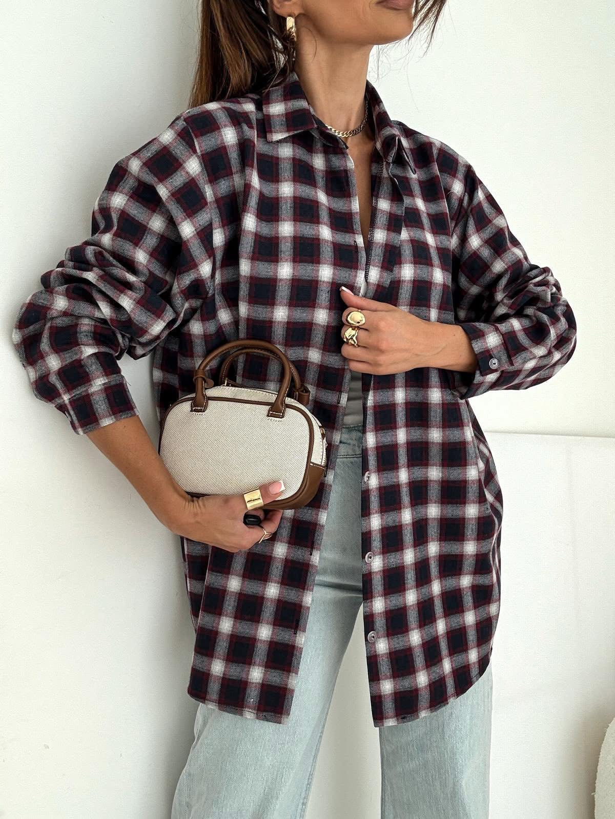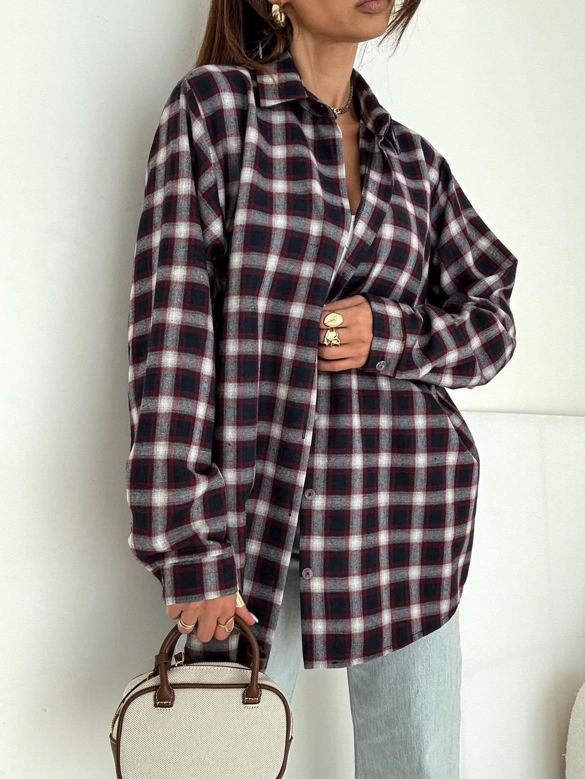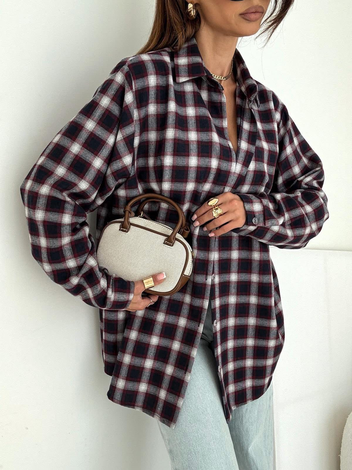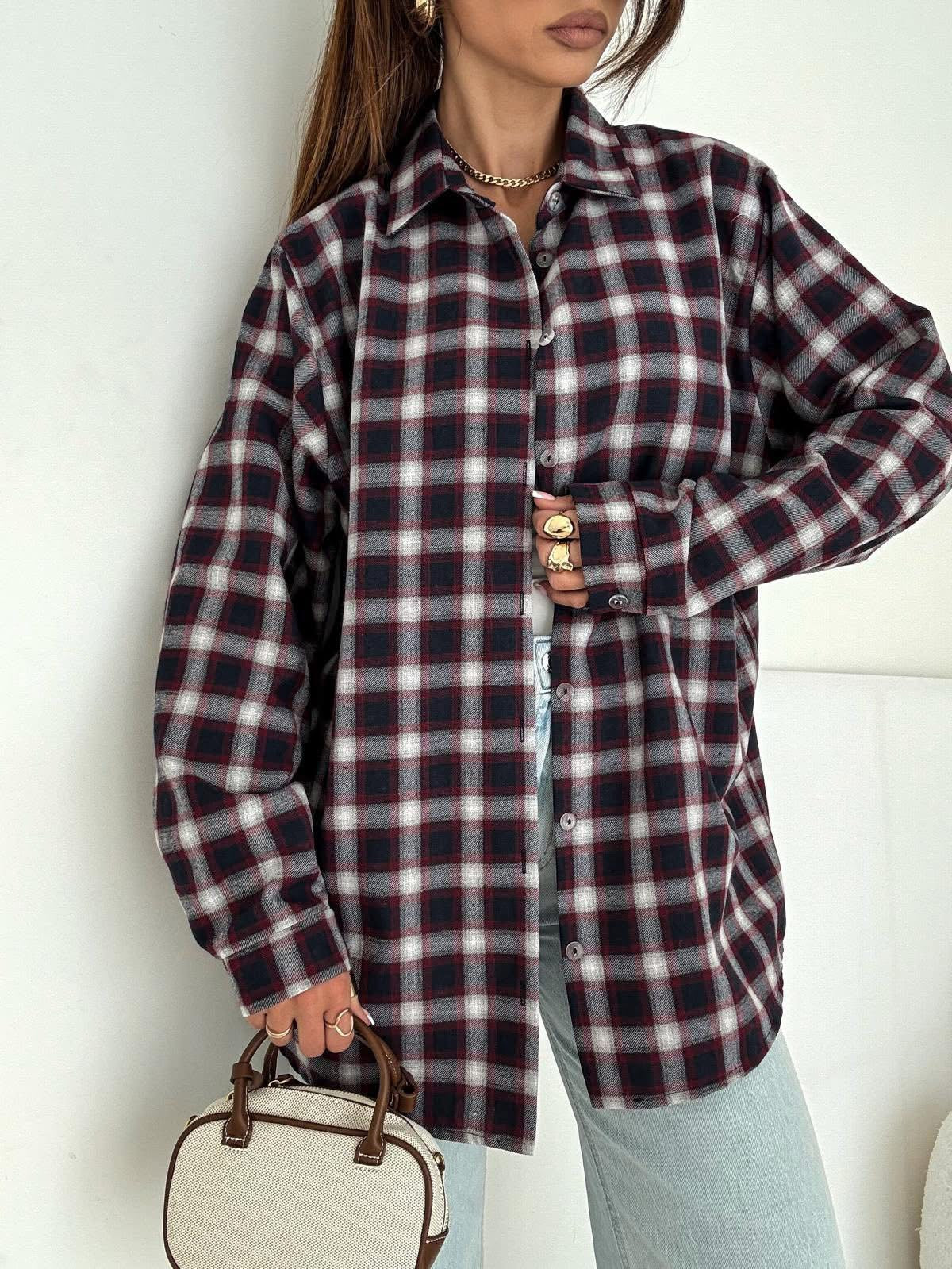 Šie marškiniai yra laisvo kirpimo languoti, puikiai tinkantys kasdieniam bei laisvalaikio stiliui. Audinys – minkštas, patogus, su klasikinio stiliaus raudonai–pilkai–mėlynų langelių raštu. Jie turi ilgas rankoves (rankovės galima atraitoti), tradicinę apykaklę ir sagutes per visą ilgį. Dėl universalaus dizaino gali būti dėvimi tiek užsagstyti, tiek atsegti – kaip lengvas viršutinis sluoksnis ant marškinėlių ar top’o. Sudėtis : 65% poliesteris, 35% medvilnė. Vieno dydžio.