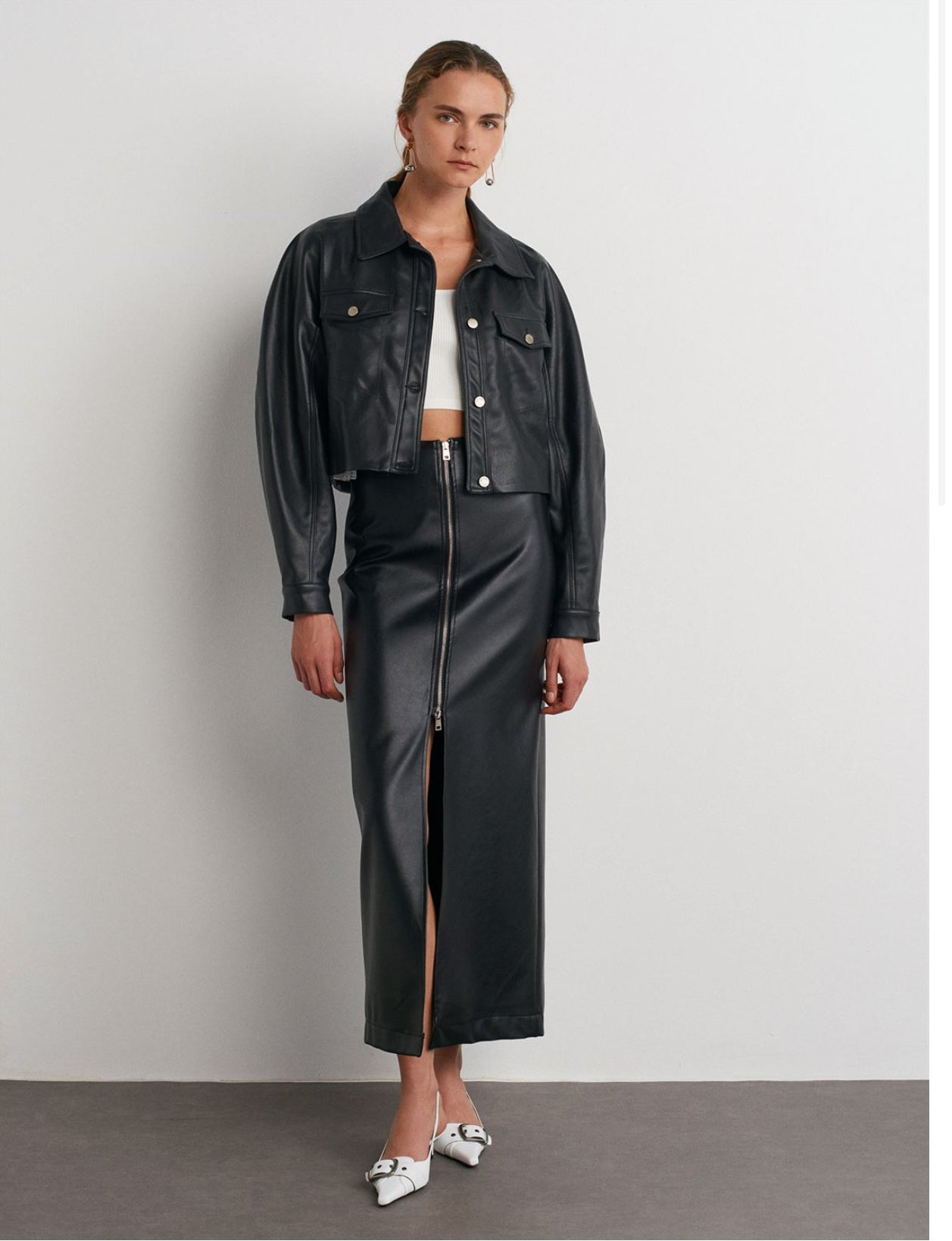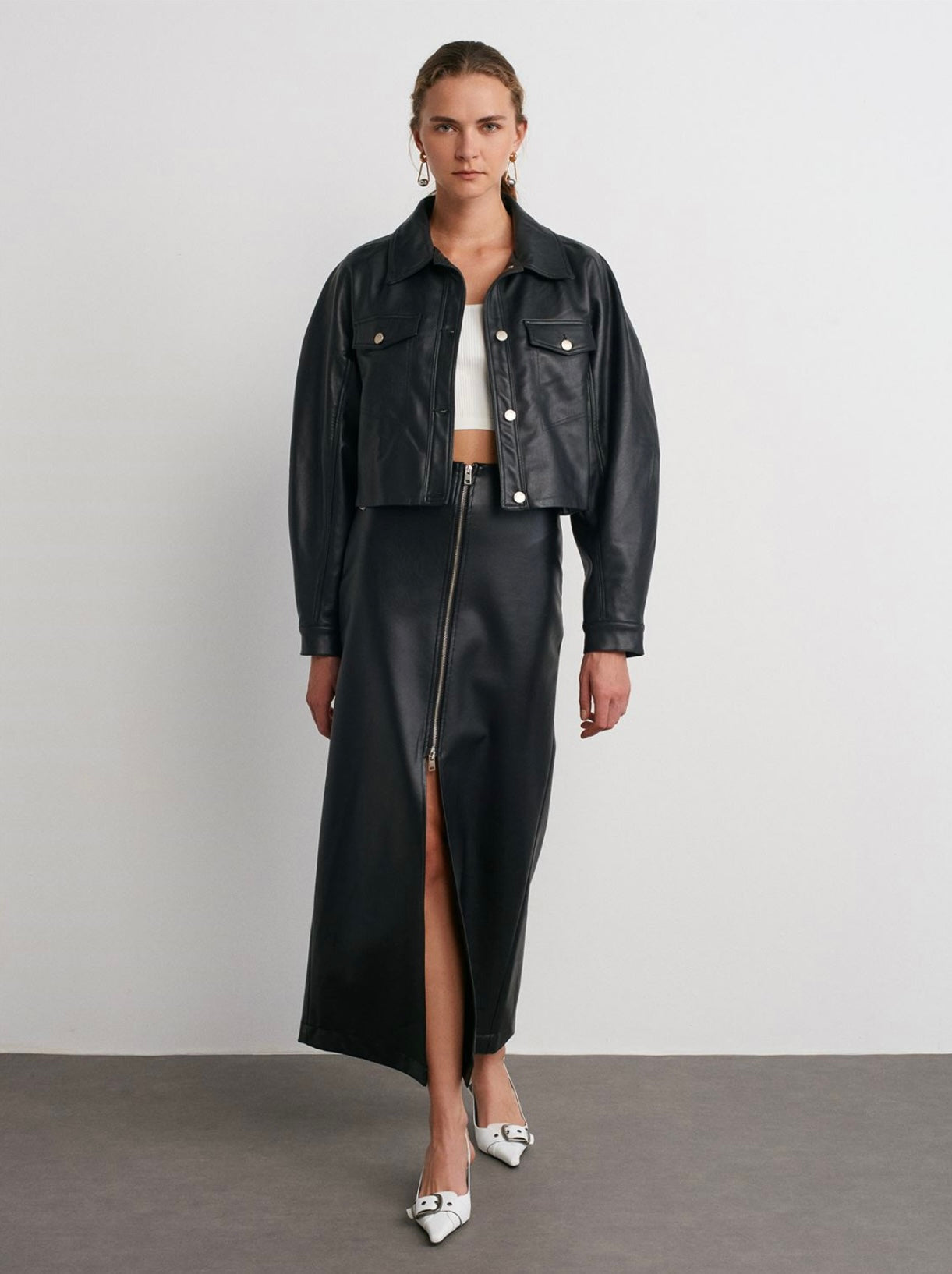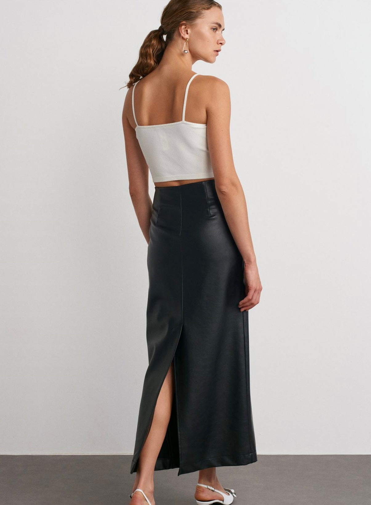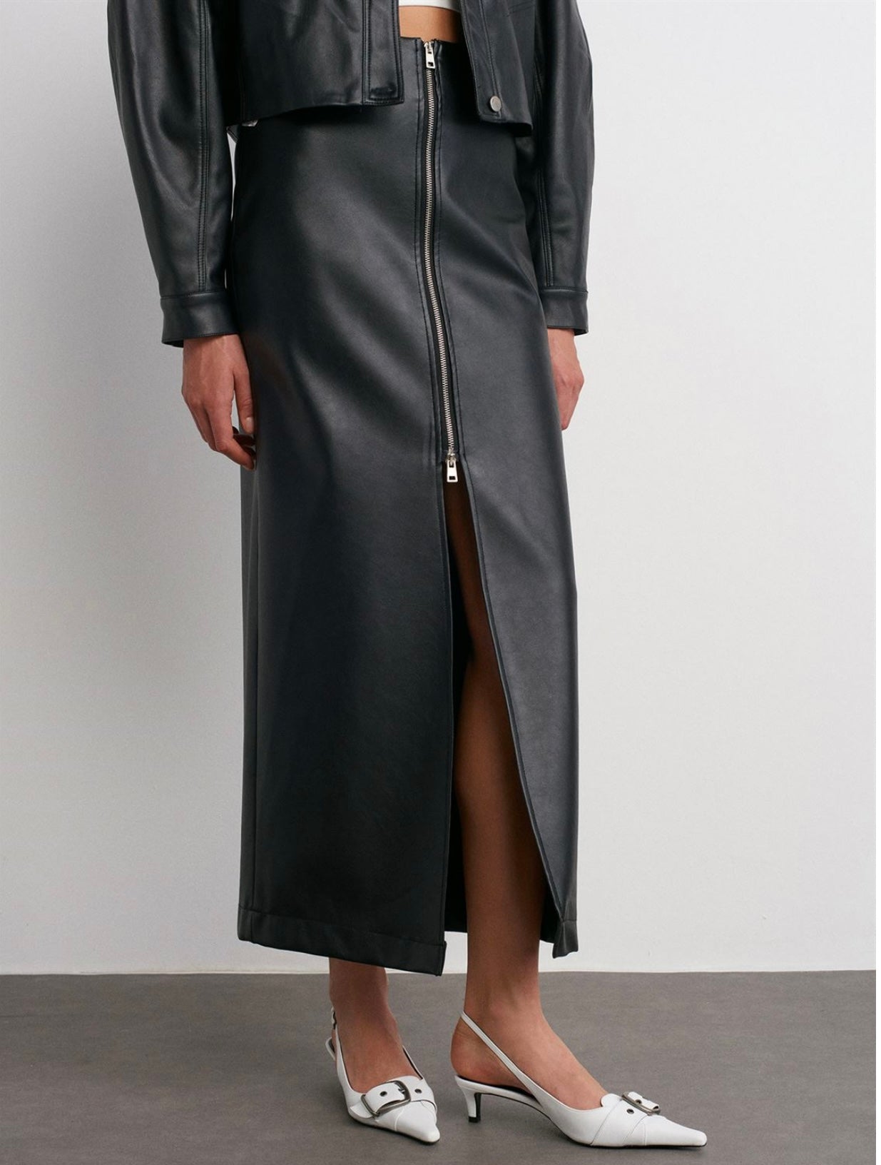 Stilingas ir modernus juodos spalvos eko odos maxi sijonas – tikras išskirtinio garderobo akcentas. Aukštos kokybės eko oda suteikia elegantišką įvaizdį, o ilgis iki kulkšnių pabrėžia moterišką siluetą.Priekyje esantis užtrauktukas per visą ilgį suteikia galimybę reguliuoti skeltuko aukštį, todėl sijoną galima dėvėti tiek minimalistiniam kasdieniam deriniui, tiek drąsiam vakariniam stiliui.