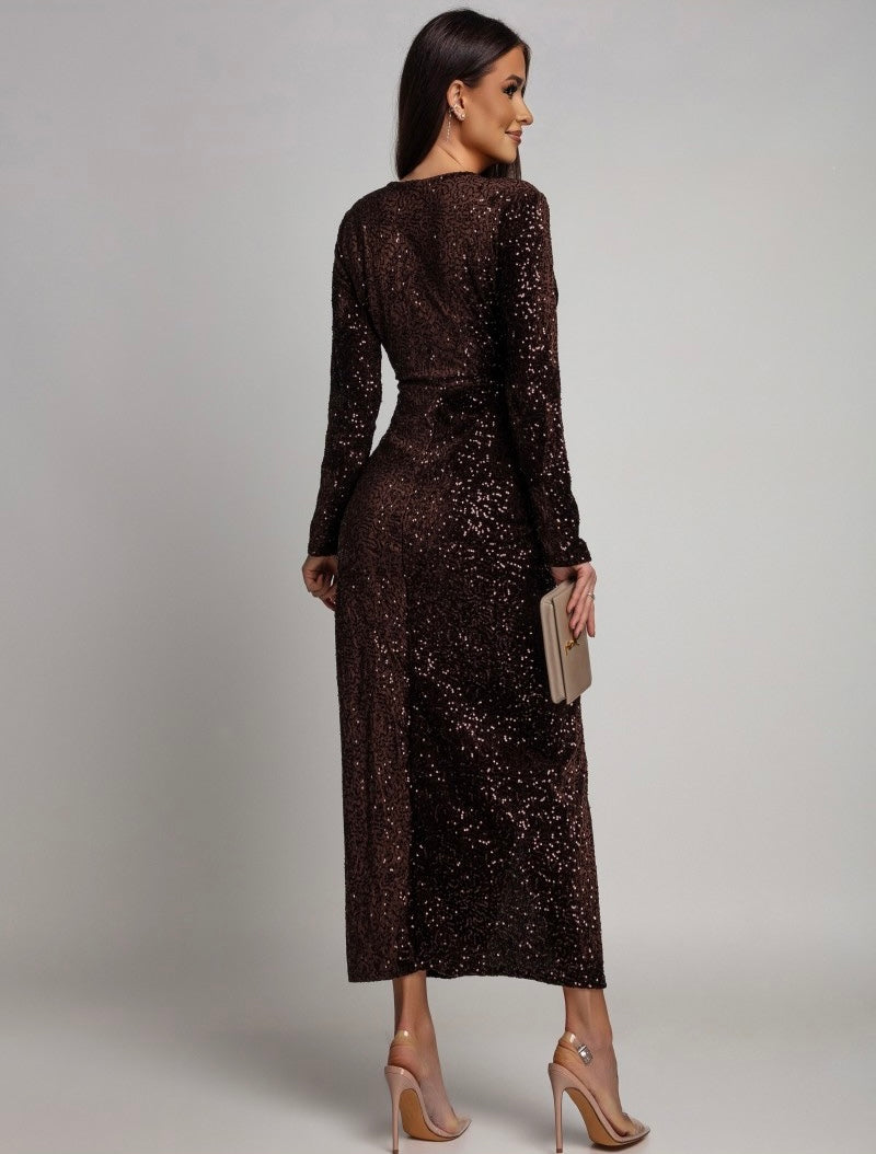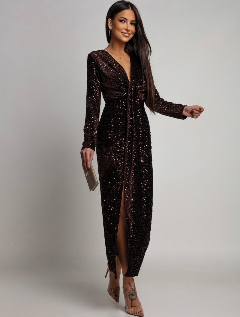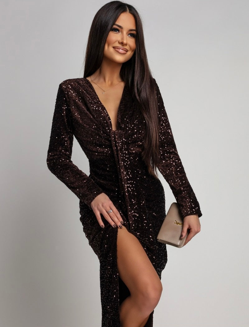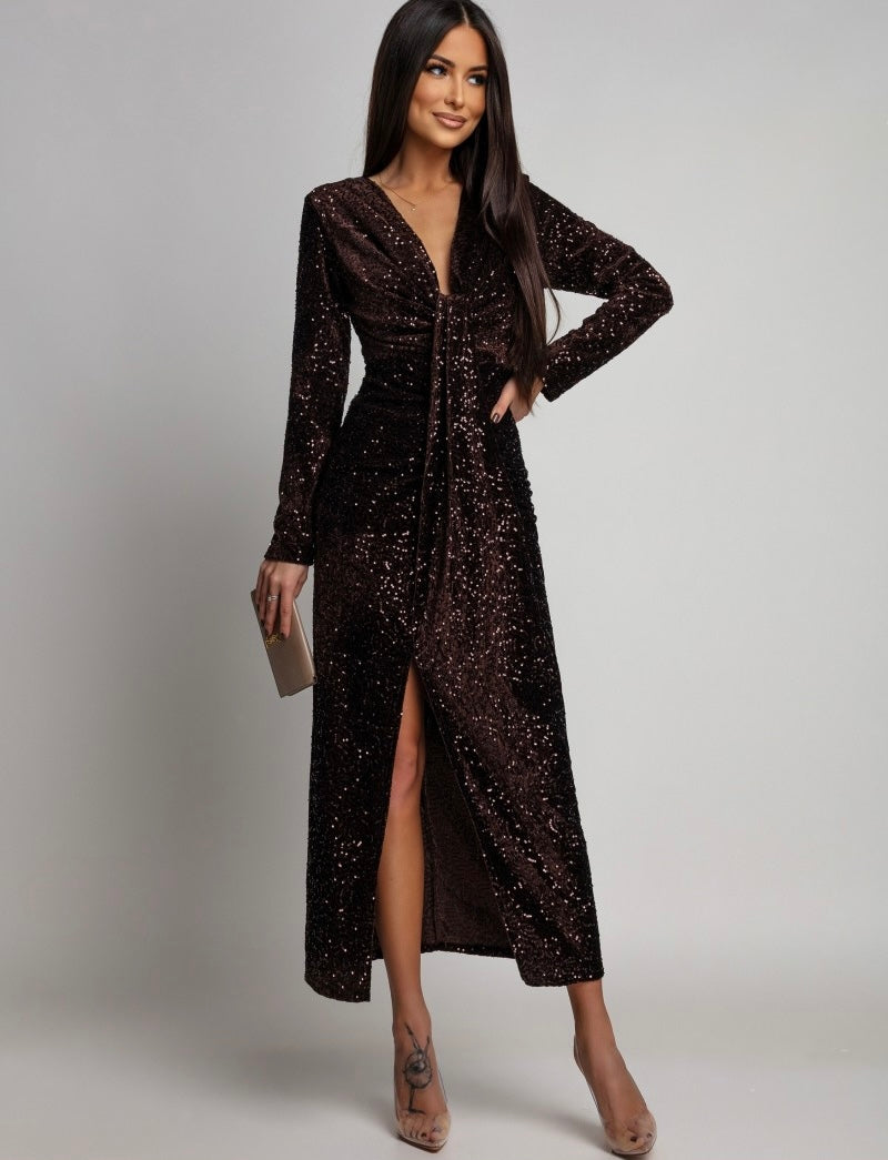 Šokoladinio atspalvio, blizgi ilga vakarinė suknelė, sukurta ypatingoms progoms. Audinys visas padengtas smulkiais žėrinčiais blizgučiais, kurie prabangiai atspindi šviesą ir suteikia išskirtinį šventinį efektą. Suknelė turi gilią, bet elegantišką V formos iškirptę, ilgas rankoves ir subtiliai priglundantį siluetą, pabrėžiantį figūrą. Ties liemeniu esantis rišamas mazgas vizualiai lieknina, suformuoja moterišką siluetą ir tampa akcentu. Priekyje esantis elegantiškas skeltukas leidžia lengvai judėti ir subtiliai atidengia koją. Ilgis – iki kulkšnių, puikiai tinkantis vakarienėms, šventėms ar iškilmingiems renginiams.