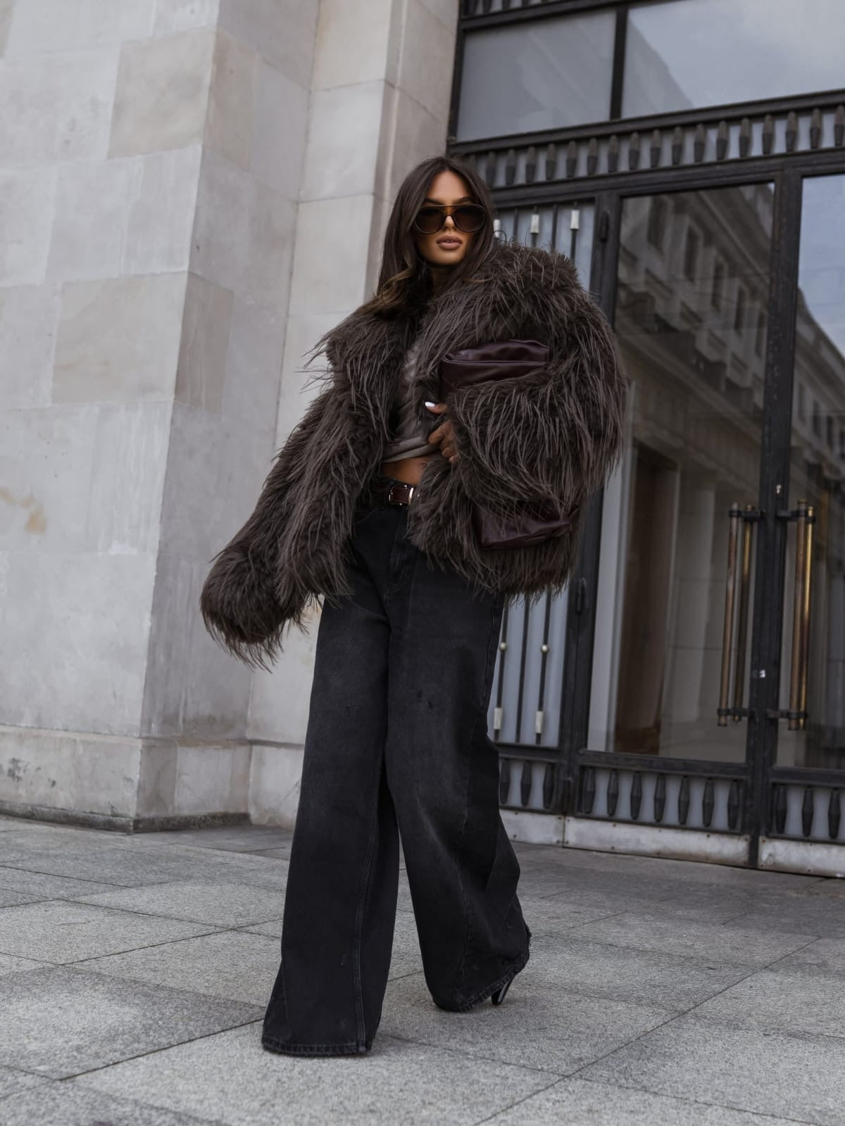 Stilingi dirbtinio kailio kailinukai su ilgo,puraus plauko tekstūra, kurie išsiskiria savo drąsiu ir madingu charakteriu. Tamsiai rudos spalvos atspalvis suteikia universalumo ir lengvai derinamas tiek prie džinsų, tiek prie suknelių. Modelis laisvo silueto, su plačiomis rankovėmis ir atvira priekine dalimi, todėl atrodo itin lengvai ir šiuolaikiškai. Šie kailinukai ne tik šildo, bet ir tampa pagrindiniu įvaizdžio akcentu – puikiai tinka miesto stiliaus ar vakaro išeigai deriniams.